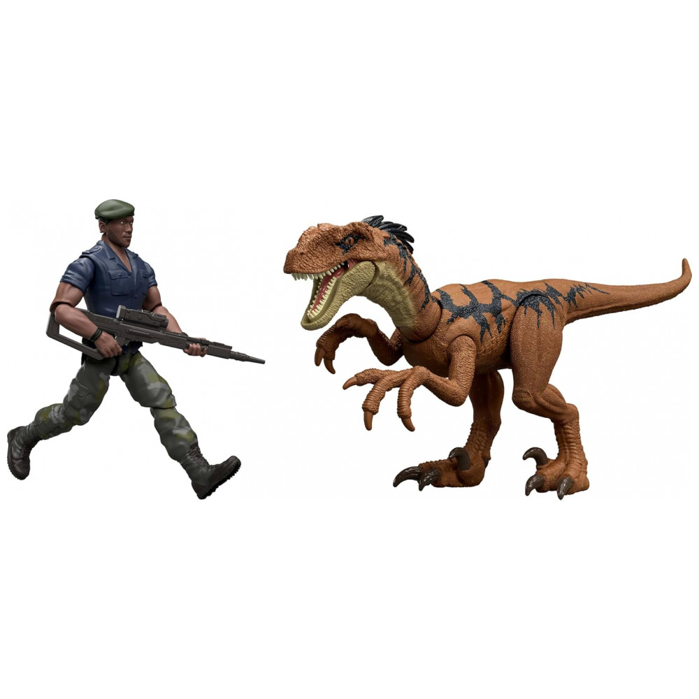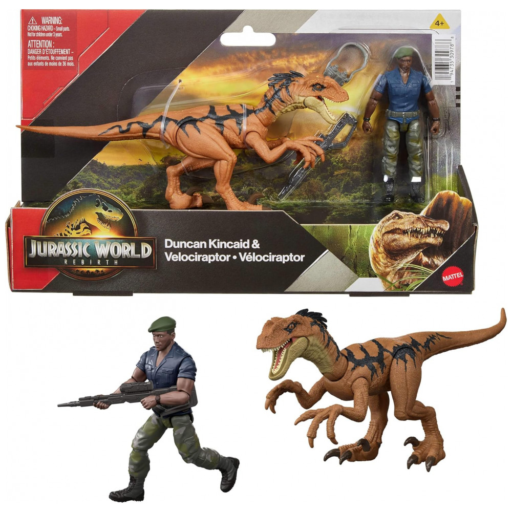 Mattel Jurassic World Rebirth – Pack Figura Humano e Dinossauro Velociraptor Duncan Kincaid 95 cm Articulada