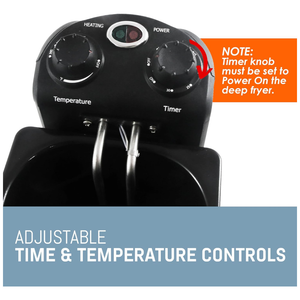 TEMPORIZADOR DE 30 MIN Os convenientes controles do temporizador com sino indicador fornecem controle total para fritar sua comida até ficar crocante, crocante e com a perfeição de um marrom dourado.