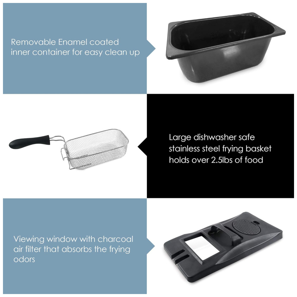 HEAT OIL FAST elemento de aquecimento totalmente imersível e botão de controle de temperatura ajustável aquece até 190 C rápido e rápido, para resultados crocantes extras dourados. Inclui uma tampa ventilada de toque frio com filtragem de odores.