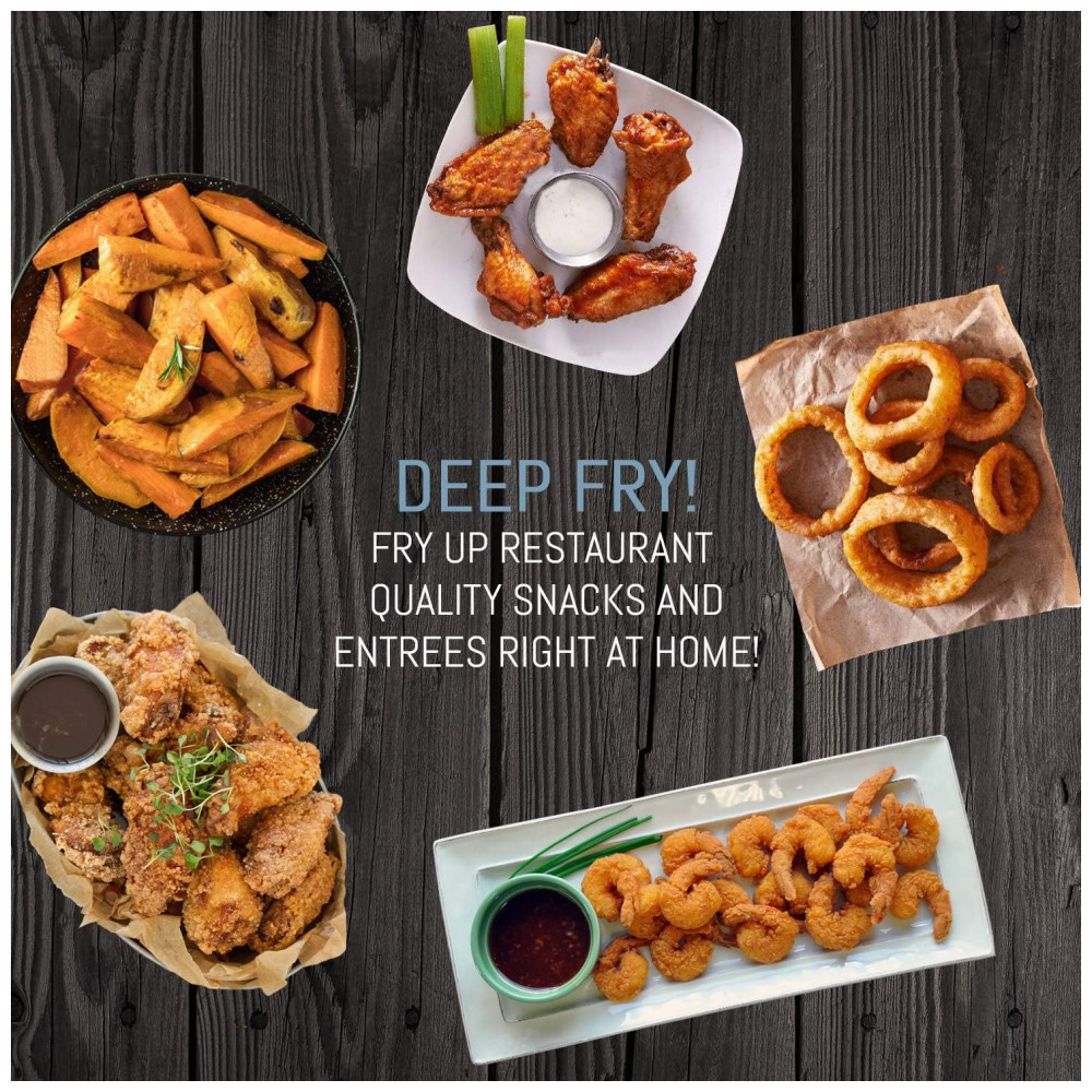 GRANDE CAPACIDADE capacidade total de 3,5 litros ou 14 xícaras, que permite fritar até 1 kg de comida por lote, como asas de frango de búfalo ou anéis de cebola dourados crocantes.