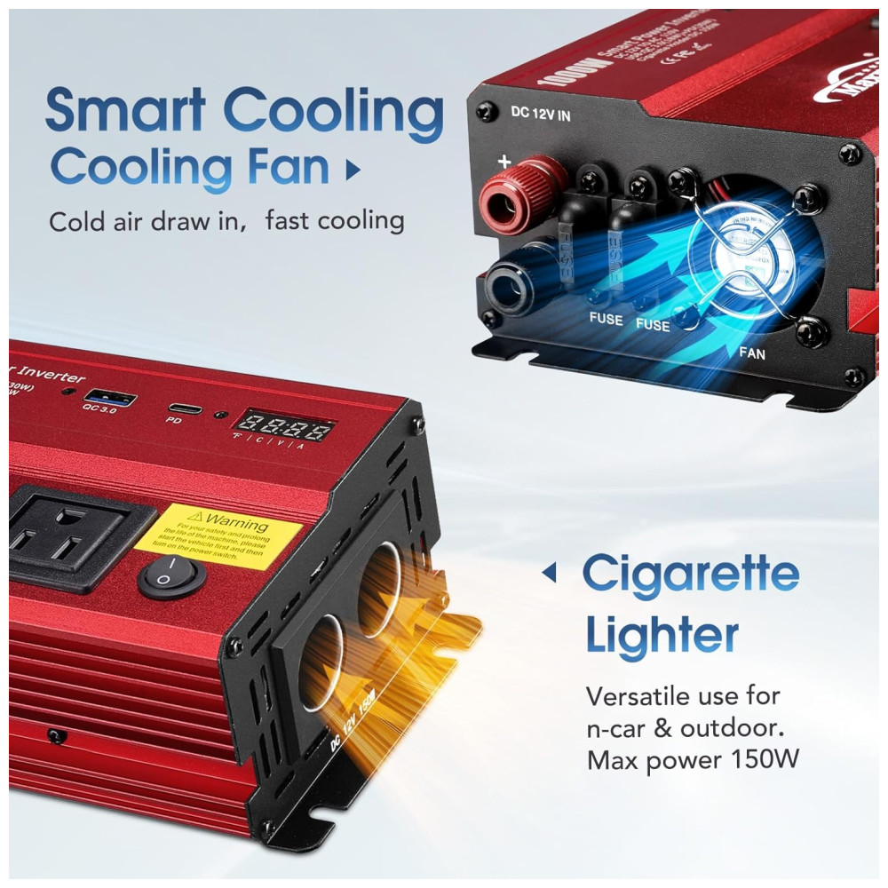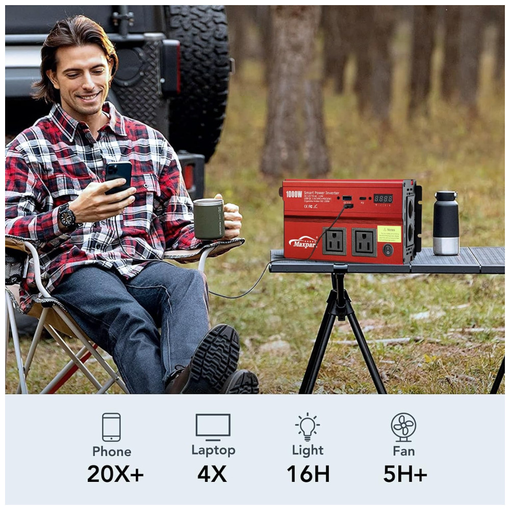 Inversor de alta potência de 1000 W Fornece saídas de corrente contínua de 110 V CA para saída de energia contínua de CC para CA, duas portas 2.4AUSB e acendedor de cigarros de 12 V duplo, portas USB duplas podem carregar a maioria dos telefones e tablets simultaneamente, enquanto as tomadas de CA são ideais para carregar laptops, mama bomba, kindle, luzes, iPad, etc.