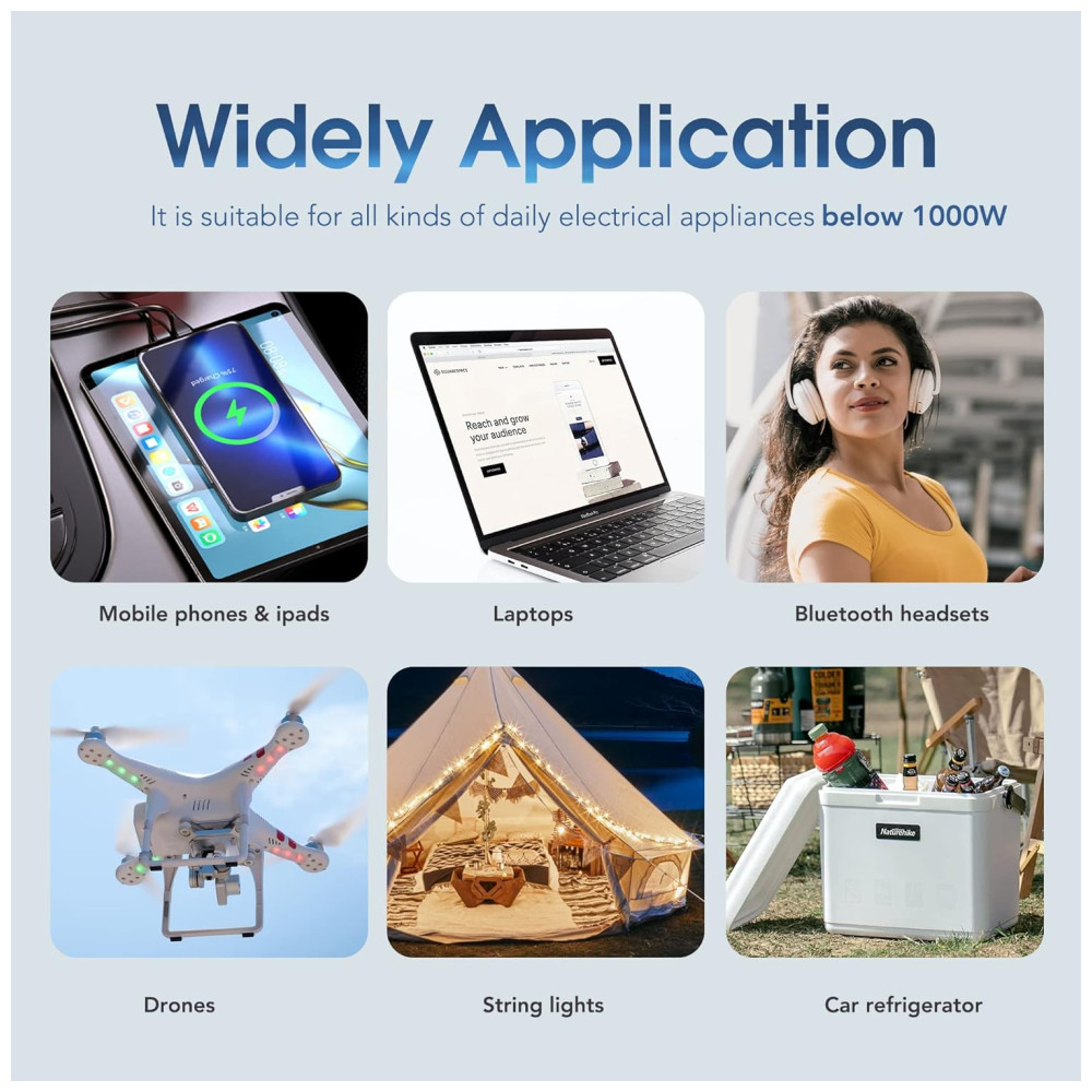 Uso doméstico ou ao ar livre Ele pode ser conectado a um isqueiro de veículo ou bateria de 12 V diretamente, para conectar se a ele para alimentar seu dispositivo em caso de emergência, furacão, tempestade, tempestade de neve e interrupção. Enquanto você estiver dirigindo, conecte o ao isqueiro, pode fornecer até 120 watts de potência contínua quando você está em um acampamento, você pode conectá lo diretamente à bateria do carro, ele fornecerá até 1000 watts de energia contínua