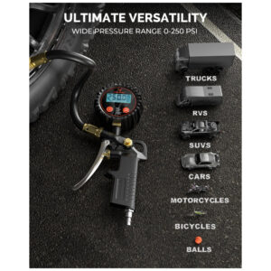 A precisão de nível profissional deste resistente medidor de pressão de pneus com inflador é manualmente calibrada para o padrão ANSI B40.7 Grau 2A, com variação de apenas 0,5 PSI. O medidor de pressão digital da ETENWOLF pode medir com precisão a pressão dos pneus de uma variedade de veículos, incluindo carros, caminhões, SUVs, RVs, motocicletas, bicicletas e muito mais. A funcionalidade tudo-em-um do medidor de pressão T500 combina inflador, bico de ar, medidor, mangueira e válvula de sangria em uma única ferramenta versátil. Oferece capacidades de esvaziamento, inflação e verificação da pressão dos pneus. Além disso, inclui uma agulha para inflar bolas esportivas e vem com núcleos de válvula e tampas de válvula para manutenção dos pneus. Com saída de compressor de ar NPT compatível com conexões padrão de compressor de ar NPT, o medidor de pressão para pneus oferece uma conexão confiável e eficiente para uma ampla gama de ferramentas e acessórios de ar. Adequado para condições climáticas extremas, o medidor de pressão de pneus da ETENWOLF funciona de forma confiável em temperaturas extremas, de -10°C a 60°C, garantindo leituras precisas tanto em condições frias quanto quentes. As baterias AAA substituíveis são fáceis de trocar e ajudam a prolongar a vida útil do medidor de pressão de pneus, com retroiluminação para iluminar a tela e facilitar a leitura da pressão dos pneus.