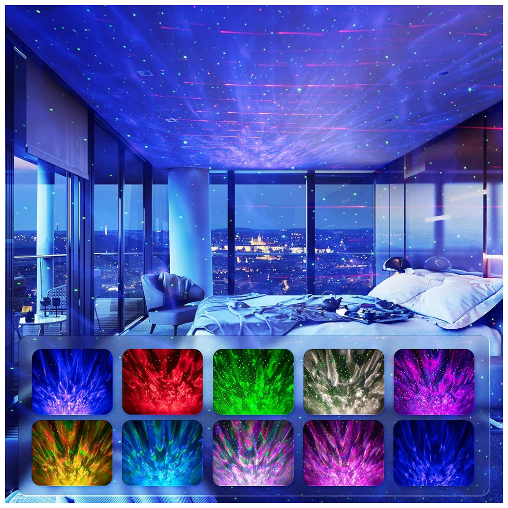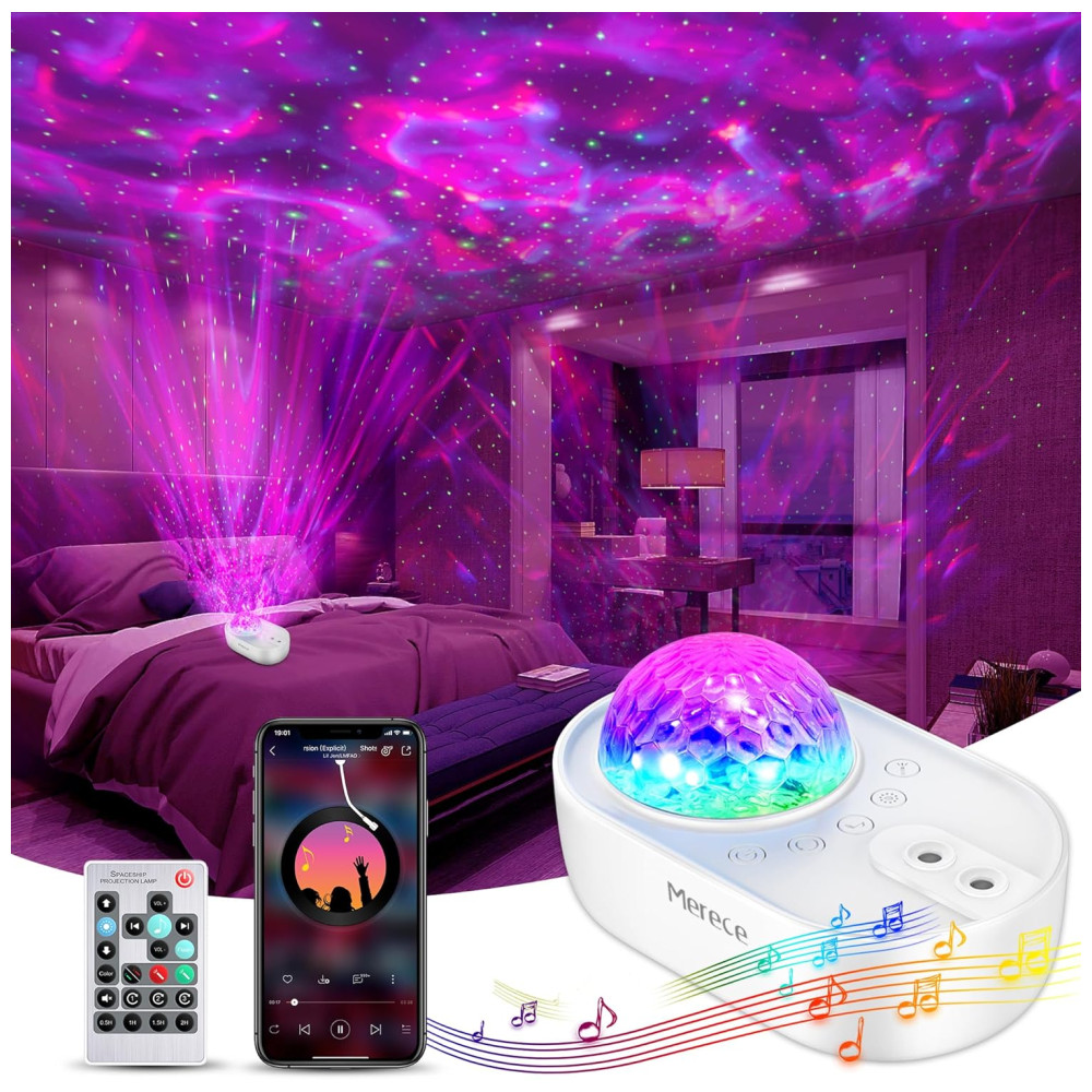 PROJETOR DE LUZ NOTURNA 3 em 1 Projetor Galaxy White Noise Machine Alto falante Bluetooth. Uma galáxia interna com um incrível show de luzes estreladas Com 10 cores, projeções dinâmicas rotacionais de 360 e estrelas cadentes de tirar o fôlego, o projetor de luz noturna traz o céu estrelado para o seu quarto e transforma seu teto vazio em um planetário doméstico para sua própria odisséia espacial noturna. Você ficará surpreso com o efeito deslumbrante quando o meteoro passar pela noite.