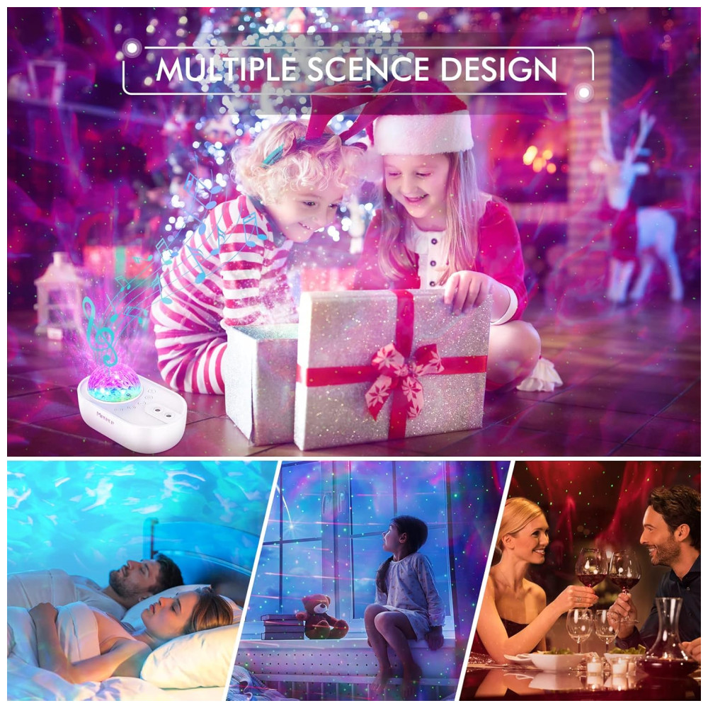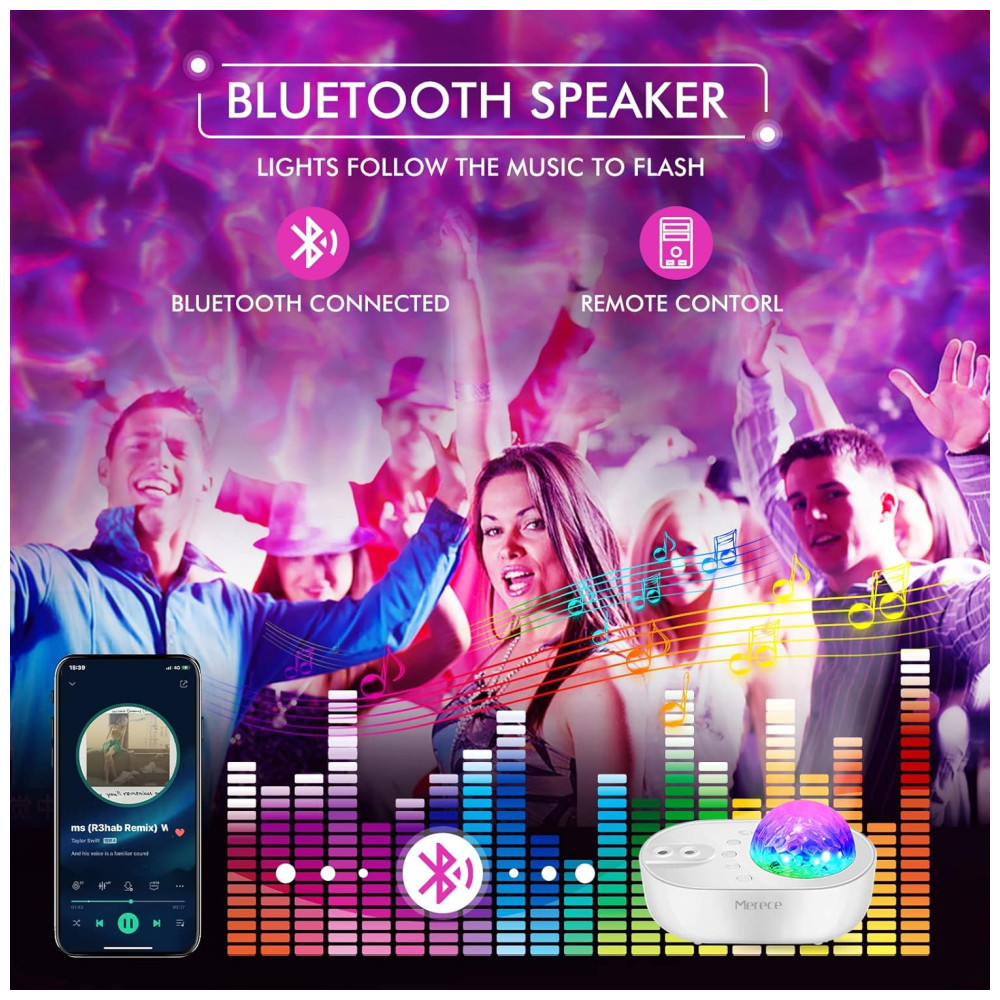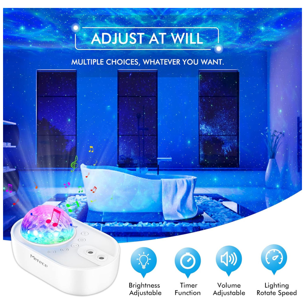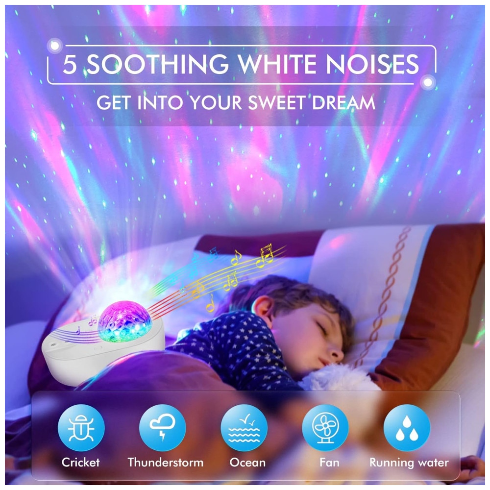 CINCO TIPOS DIFERENTES DE RUÍDO BRANCO O AJUDARÃO A FALAR O Galaxy Projector inclui cinco populares ruídos brancos integrados VENTILADOR, TEMPESTADE, GRILO, ÁGUA CORRENTE e ONDA DE OCEANO. Escolha o que você mais gosta e deixe as estrelas de tirar o fôlego e as nebulosas fluentes acalmá lo para dormir. Crianças e adultos podem desfrutar de uma noite inteira de bons sonhos. Você também pode conectar seu projetor de luz noturna com Bluetooth e reproduzir qualquer música que desejar.
