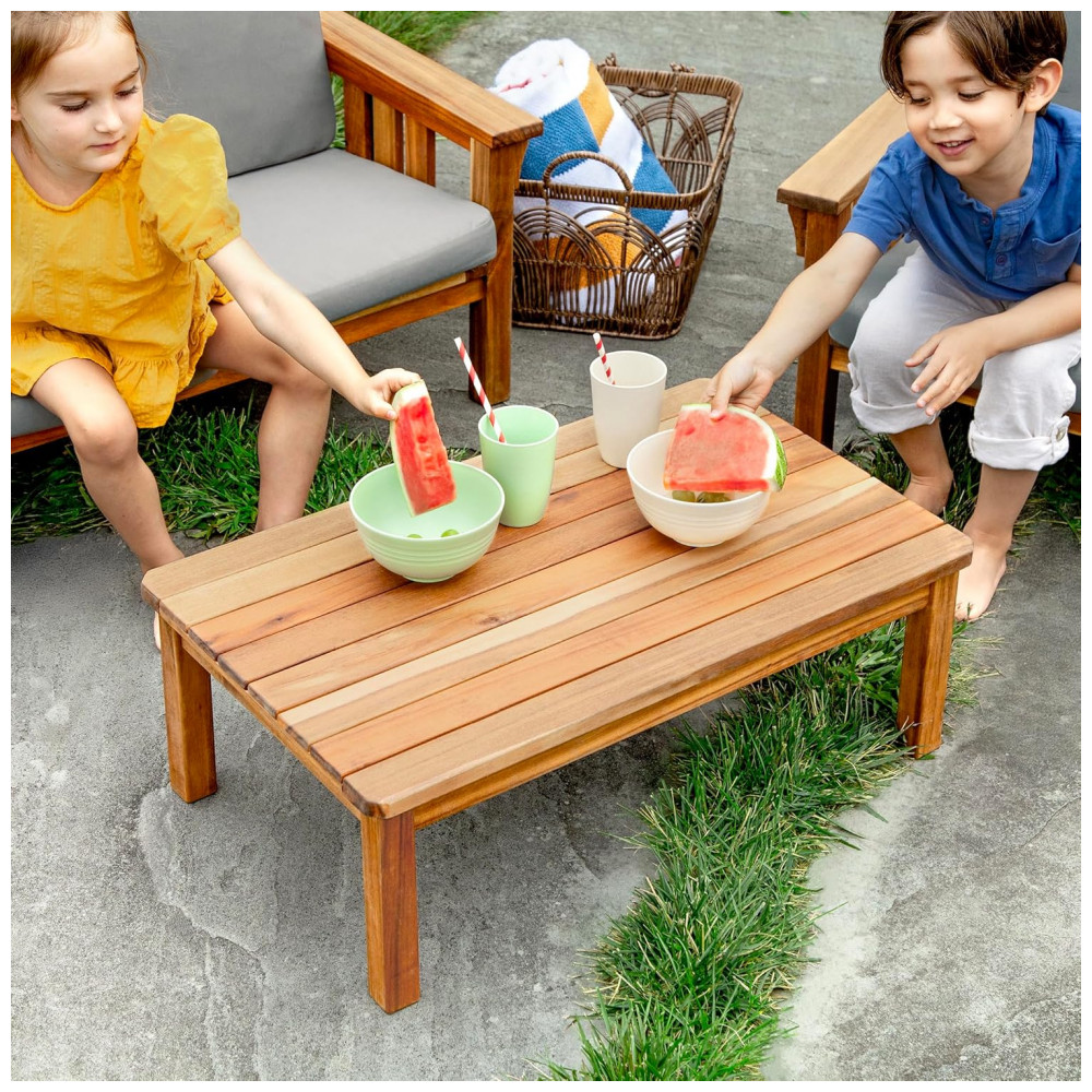 Mesa baixa infantil para área externa em madeira acácia, desenvolvida para atividades de arte, leitura, brincadeiras sensoriais, lanches e momentos de convivência em jardins, pátios, varandas e salas de aula ao ar livre. A altura reduzida permite que as crianças usem a mesa sentadas em almofadas, bancos baixos ou diretamente no chão, favorecendo uma postura relaxada e próxima ao solo.