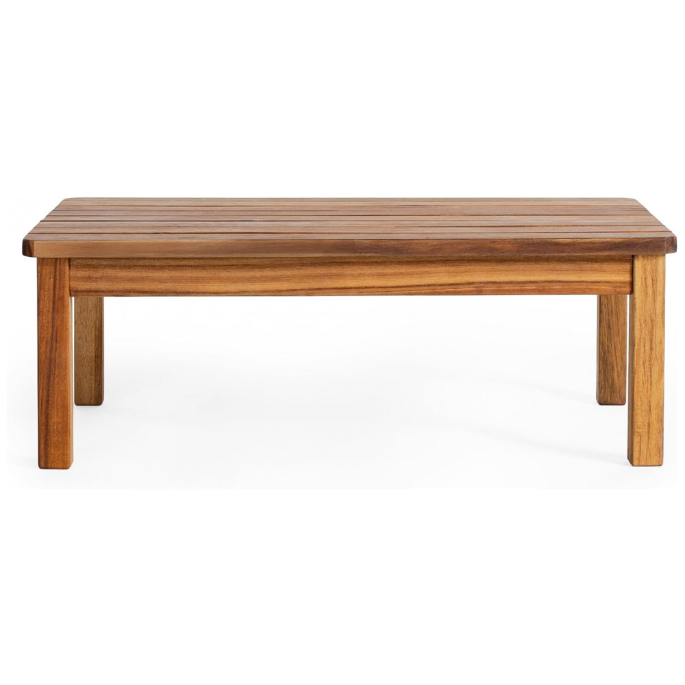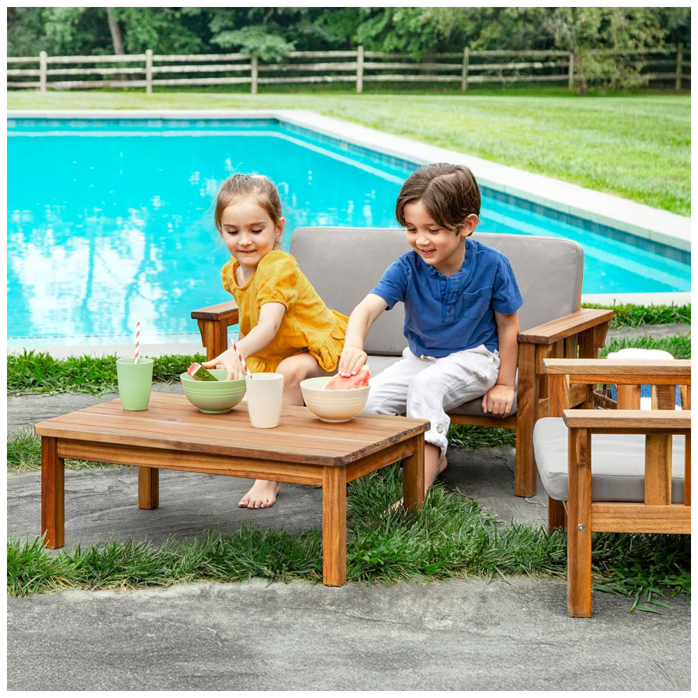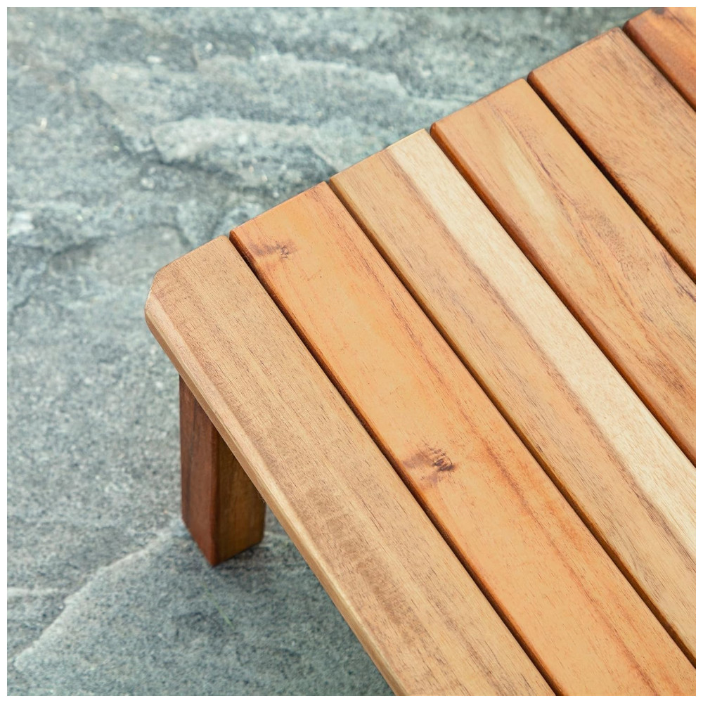 A estrutura é inteiramente produzida em madeira acácia, material naturalmente resistente às intempéries, indicada para uso permanente em ambientes externos, desde que sejam seguidos cuidados básicos de limpeza e manutenção. O tampo retangular de linhas simples e acabamento em tom natural se integra visualmente a outras peças da coleção externa infantil, como sofás e poltronas, formando um conjunto coerente e acolhedor.