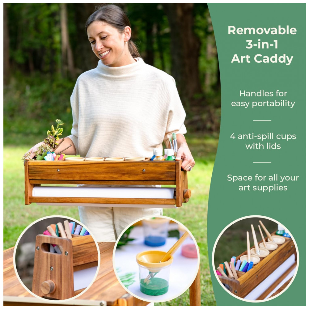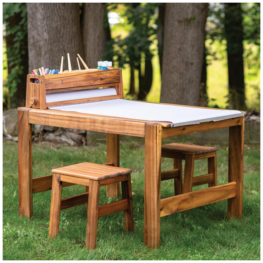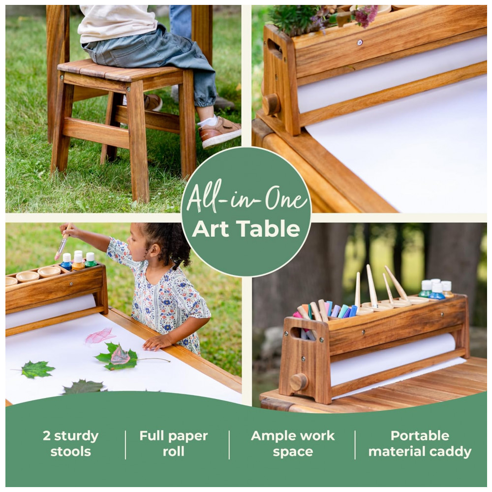 Mesa de arte infantil externa Guidecraft Acadia Natural em madeira acácia com 2 bancos caddy e rolo de papel