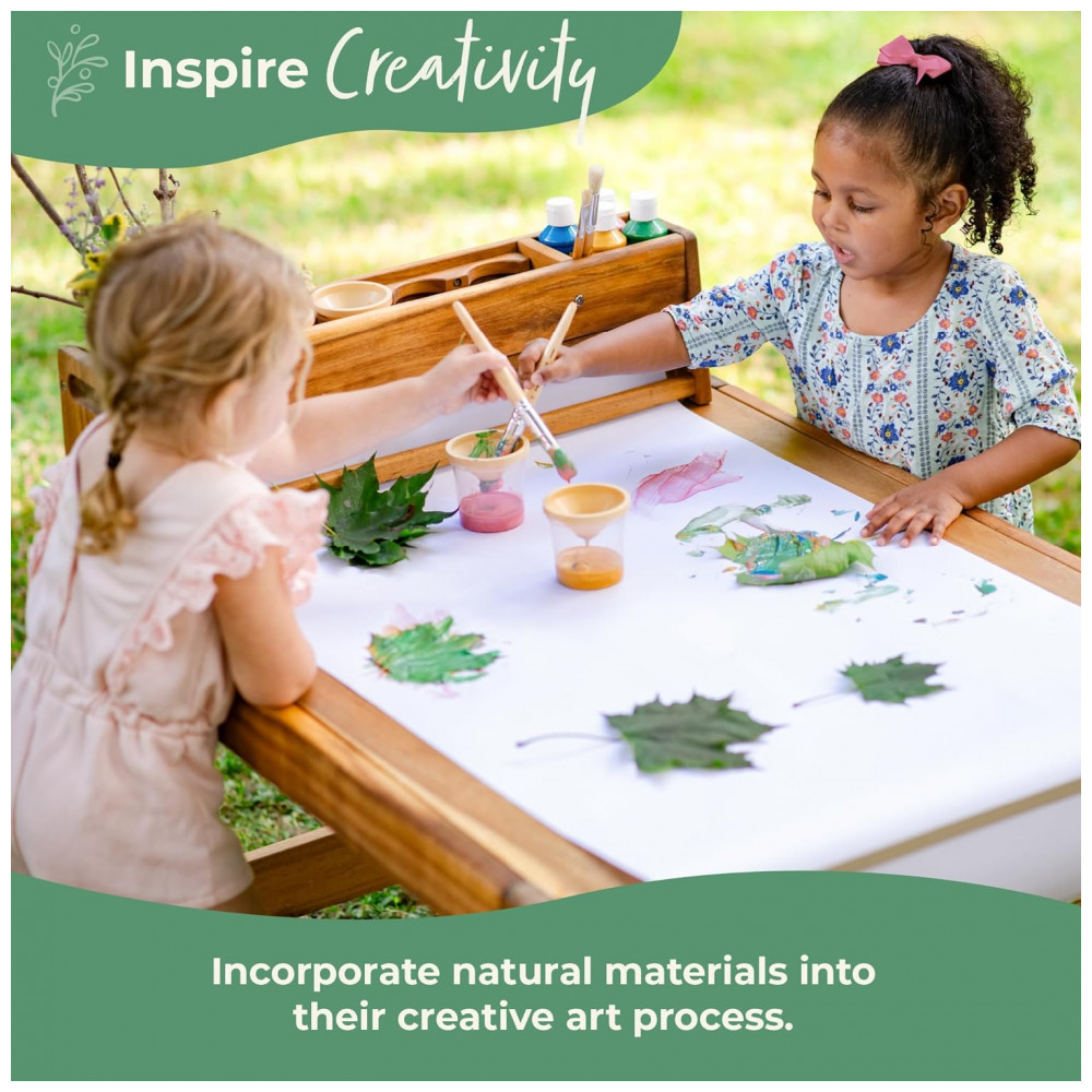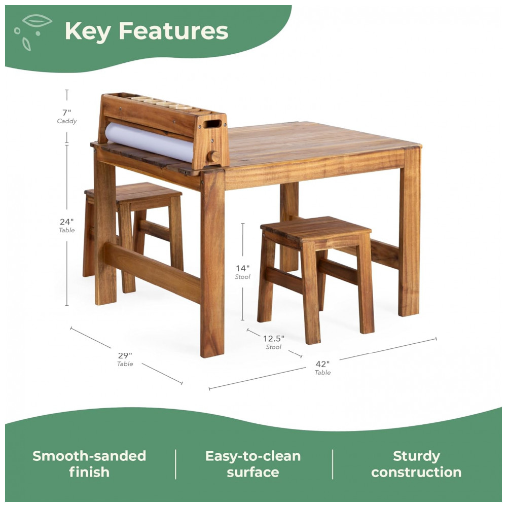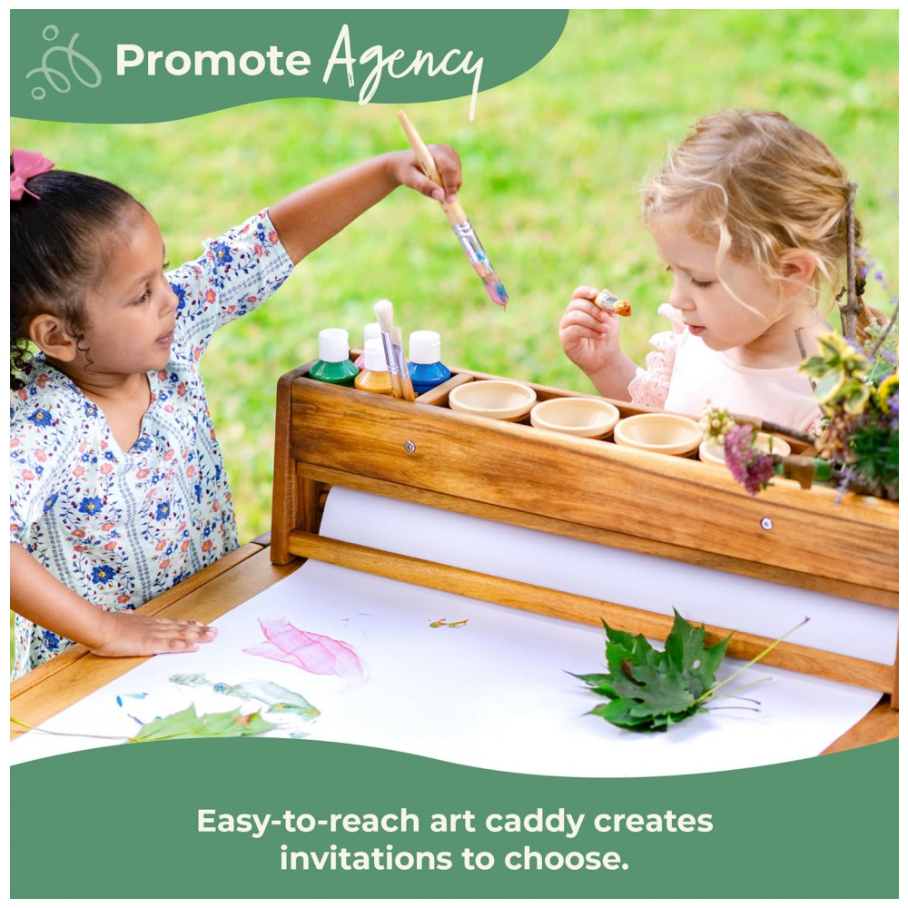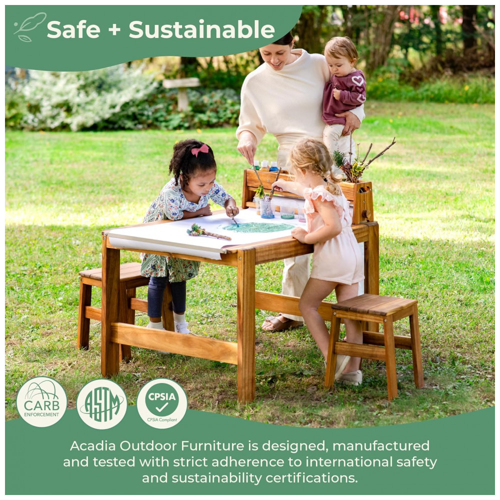 Mesa de arte infantil externa Guidecraft Acadia Natural em madeira acácia com 2 bancos caddy e rolo de papel