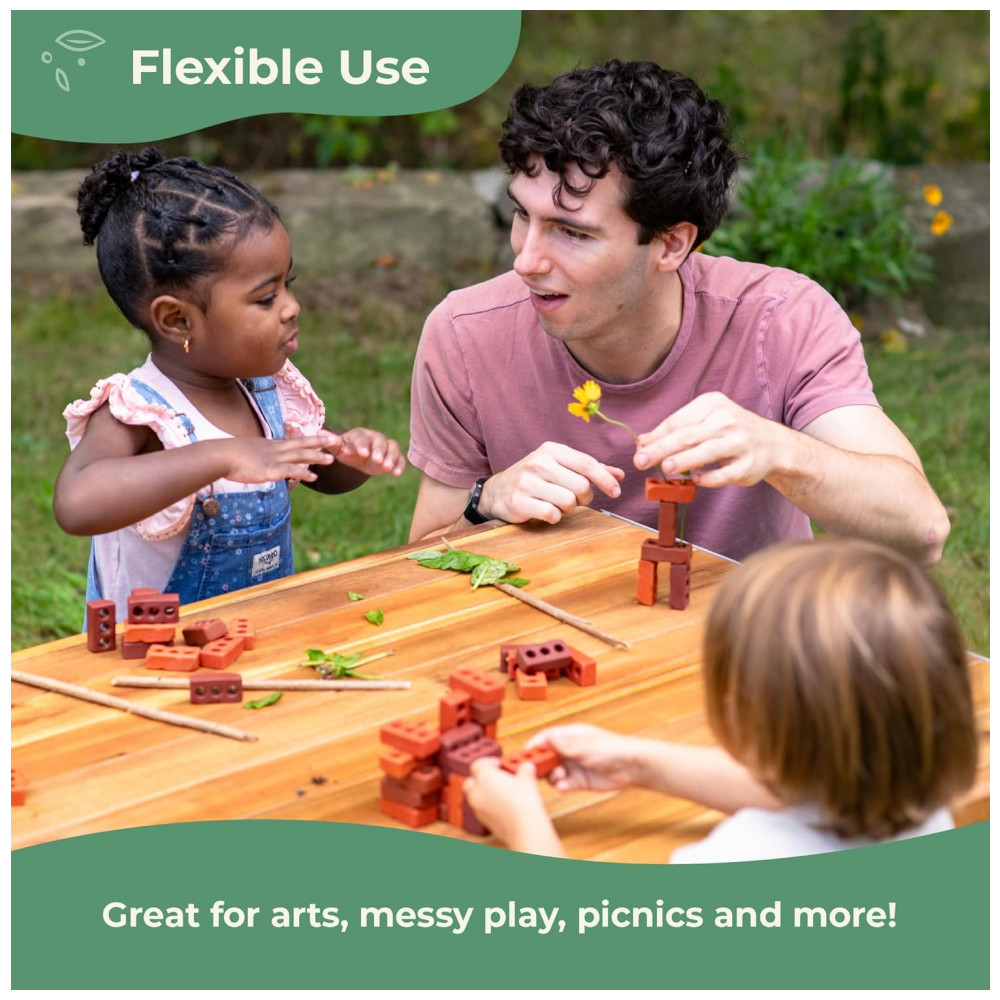 Mesa de arte infantil para área externa em madeira acácia, desenvolvida para atividades de desenho, pintura, brincadeiras sensoriais e piqueniques em quintais, pátios e jardins. A estrutura retangular oferece superfície ampla e estável para uso com diferentes materiais, com acabamento pensado para resistir à exposição ao sol, umidade e respingos de tinta dentro das rotinas de uso recomendadas para móveis externos.