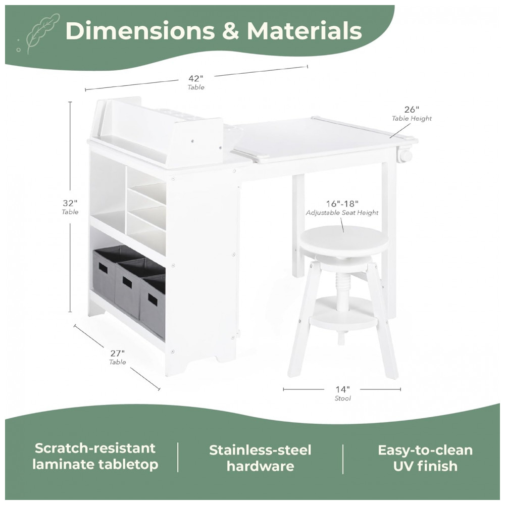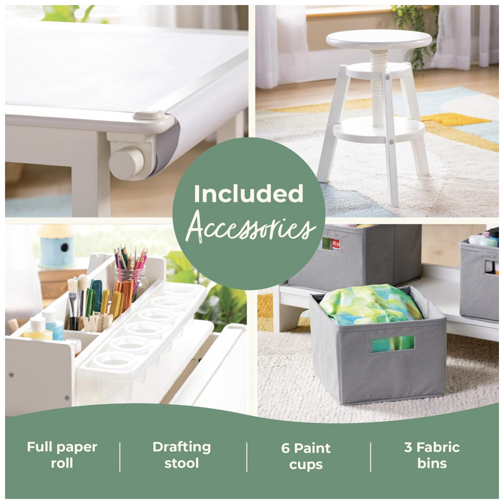 O conjunto é fabricado em madeira de pinus com alguns componentes em madeira engenheirada, com acabamento branco pintado de fácil limpeza e bordas arredondadas. A mesa incorpora três nichos laterais, três caixas de tecido, caddy de materiais, bandeja destacável para tintas com copos removíveis e compartimento interno sob o tampo para guardar papéis e suprimentos.