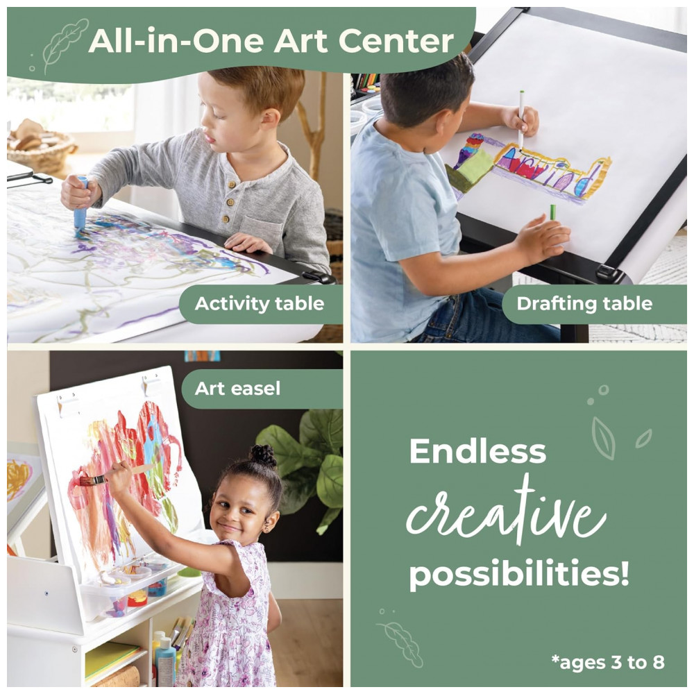 Mesa de arte infantil multifuncional 3 em 1, que funciona como mesa de atividades, mesa de desenho técnica (drafting table) e cavalete com rolo de papel, indicada para crianças em idade escolar em ambientes de estudo e brincadeira. A estrutura principal inclui tampo reclinável tipo prancheta, módulo de cavalete deslizante com lousa, banco em madeira com altura ajustável e múltiplas áreas de armazenamento para materiais de arte.