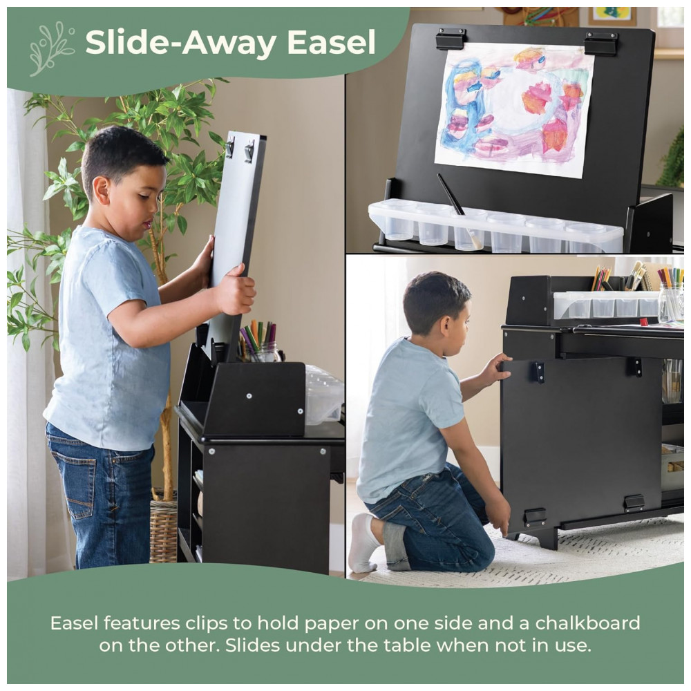 O cavalete integrado possui superfície com clipes para fixar folhas de papel de um lado e lousa preta no verso, permitindo uso com giz. Um rolo de papel acoplado com dois suportes fornece alimentação contínua de papel para desenhos e pinturas, podendo ser recolhido quando não está em uso. Quando fechado, o módulo de cavalete desliza sob a mesa, economizando espaço no ambiente.