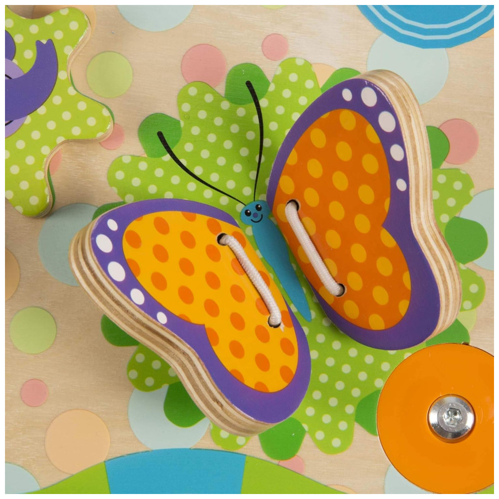 Esta mesa de atividades é ideal para crianças a partir de 12 meses, oferecendo oito atividades práticas que ajudam no desenvolvimento de habilidades importantes, como coordenação olho mão e motoras finas. A construção robusta em madeira garante estabilidade, segurança e longevidade. Com um design extravagante com tema de selva, a mesa apresenta cores brilhantes e padrões ousados. As peças anexadas são projetadas para girar, rolar, virar, girar, deslizar e muito mais, mantendo as crianças envolvidas e entretidas.