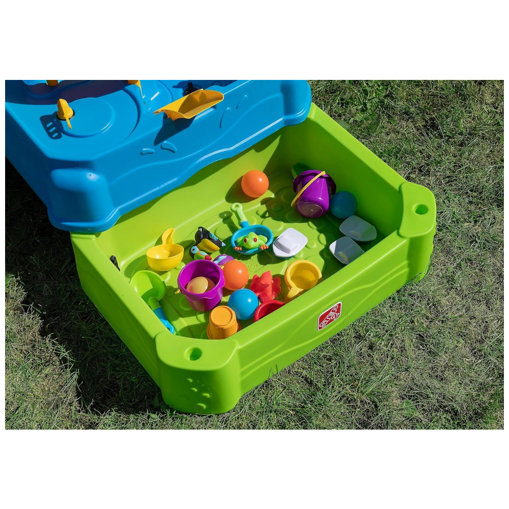 O guarda chuva removível na lateral da piscina oferece sombra em dias quentes, e a Mesa Sensorial TwoTier Wonders pode ser configurada em ambientes internos ou externos. Aumente o tempo de brincadeira trazendo grãos, feijões ou areia cinética para a mesa para aumentar a exploração sensorial.