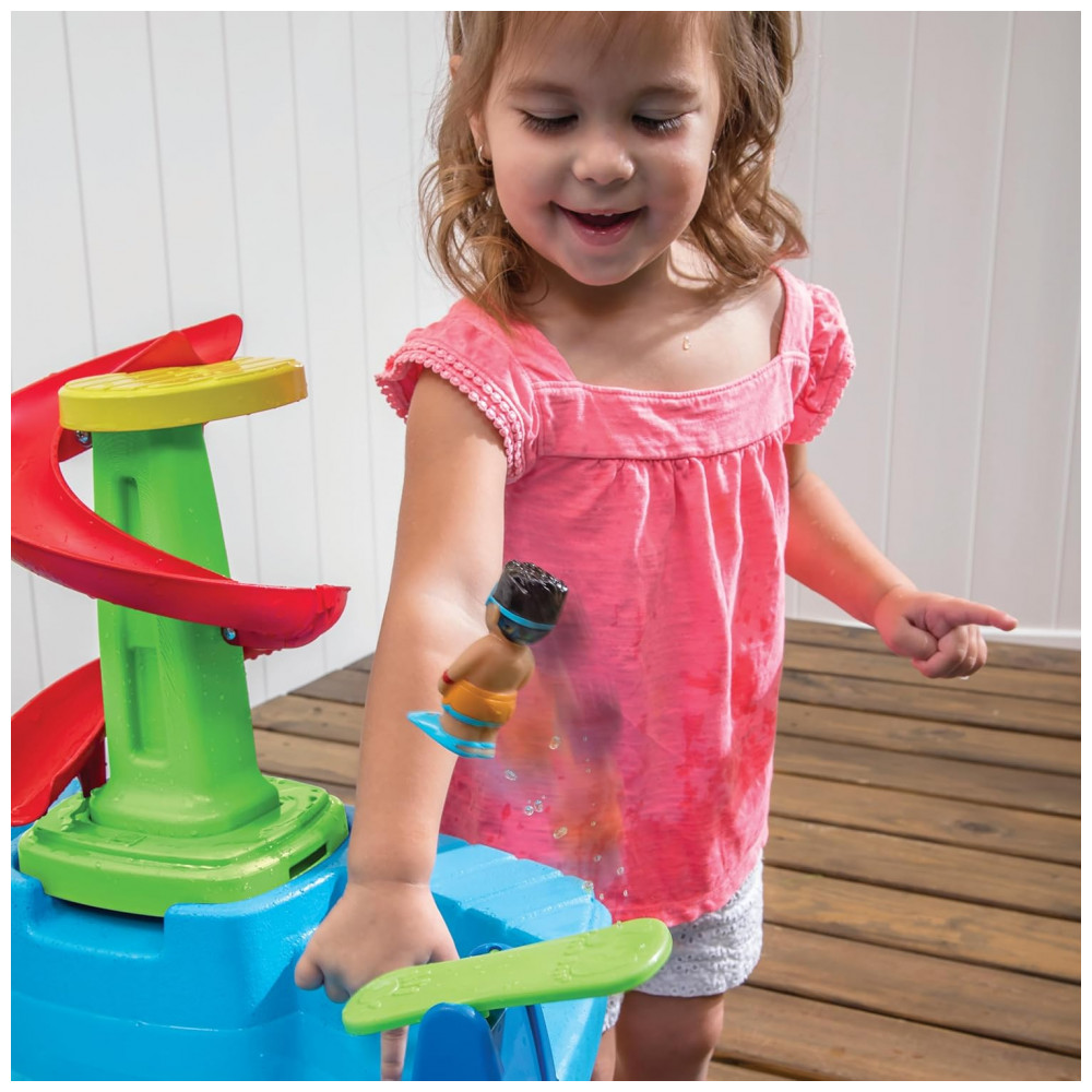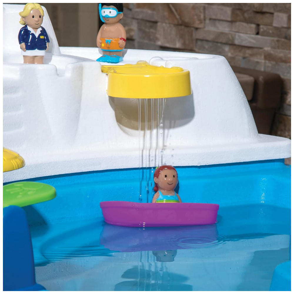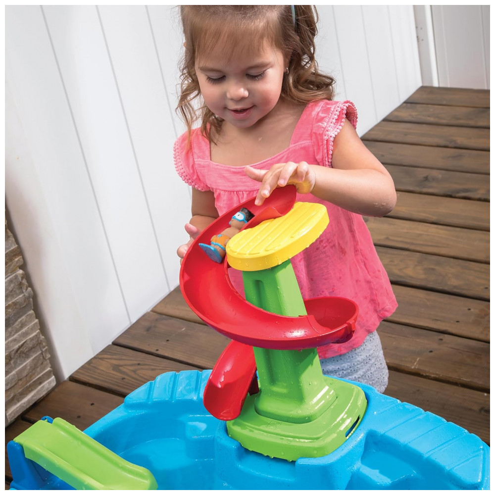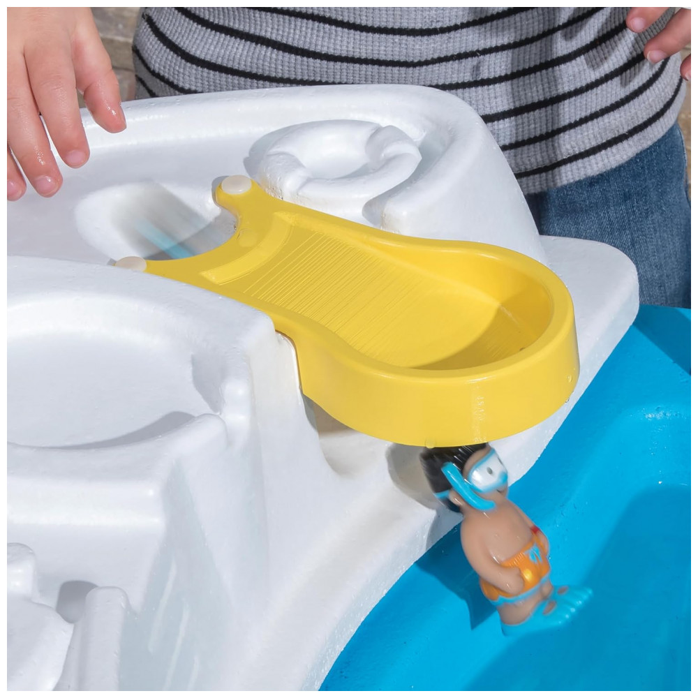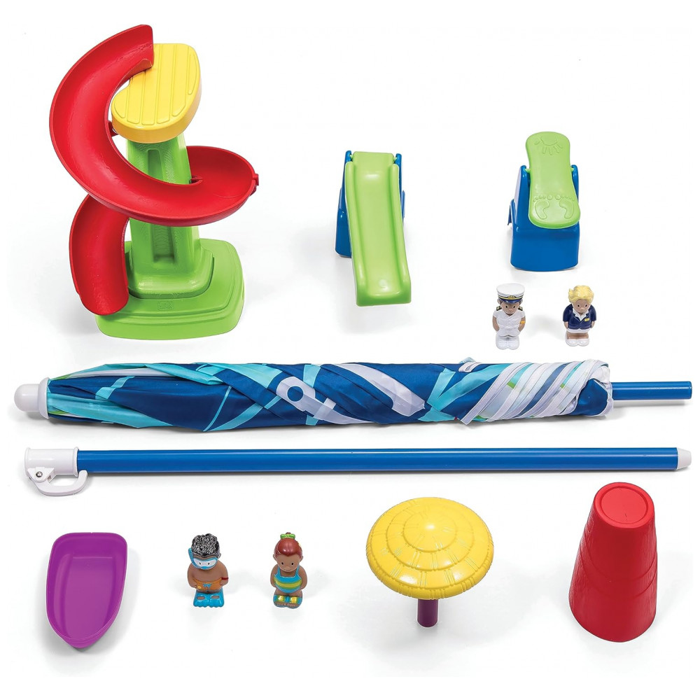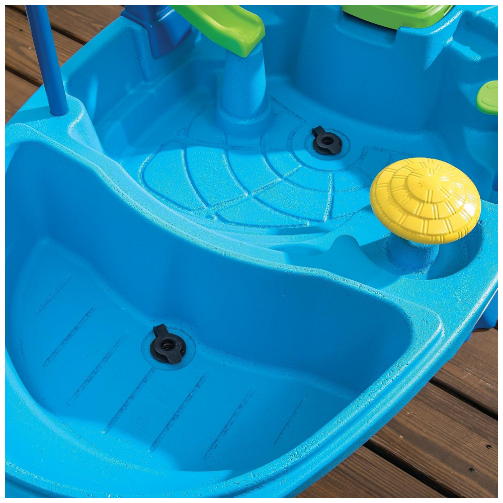 A bacia frontal pode conter até 11,37 litros de água ou 11,34 quilos de areia, enquanto a bacia traseira pode conter até 15,16 litros de água ou 18,14 quilos de areia. O kit de acessórios de 10 peças inclui uma tampa com tema de navio de cruzeiro, recursos moldados e figuras estilizadas que melhoram as habilidades motoras finas. A tampa de drenagem removível facilita a limpeza e a estrutura plástica de parede dupla proporciona durabilidade e longevidade, mantendo as cores brilhantes sem lascar, desbotar, quebrar ou descascar.