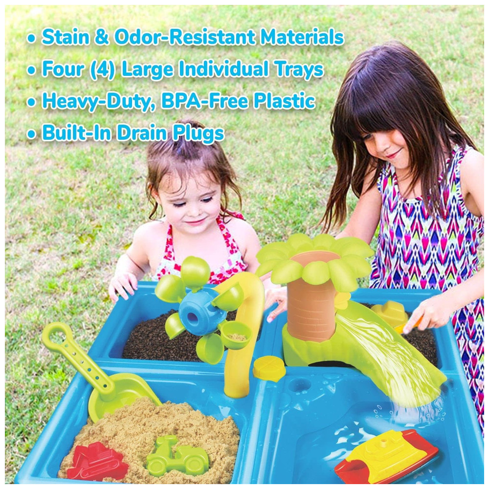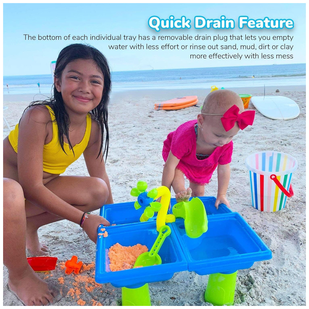 Sistema de Bandeja Grande e Resistente a Vazamentos – Com quatro bandejas individuais na mesa de areia, as crianças têm a liberdade de preenchê-las com brinquedos, água, areia, terra ou argila, proporcionando diversas opções de aprendizado. Cada bandeja possui também um plugue de drenagem rápida para facilitar a limpeza após a brincadeira.