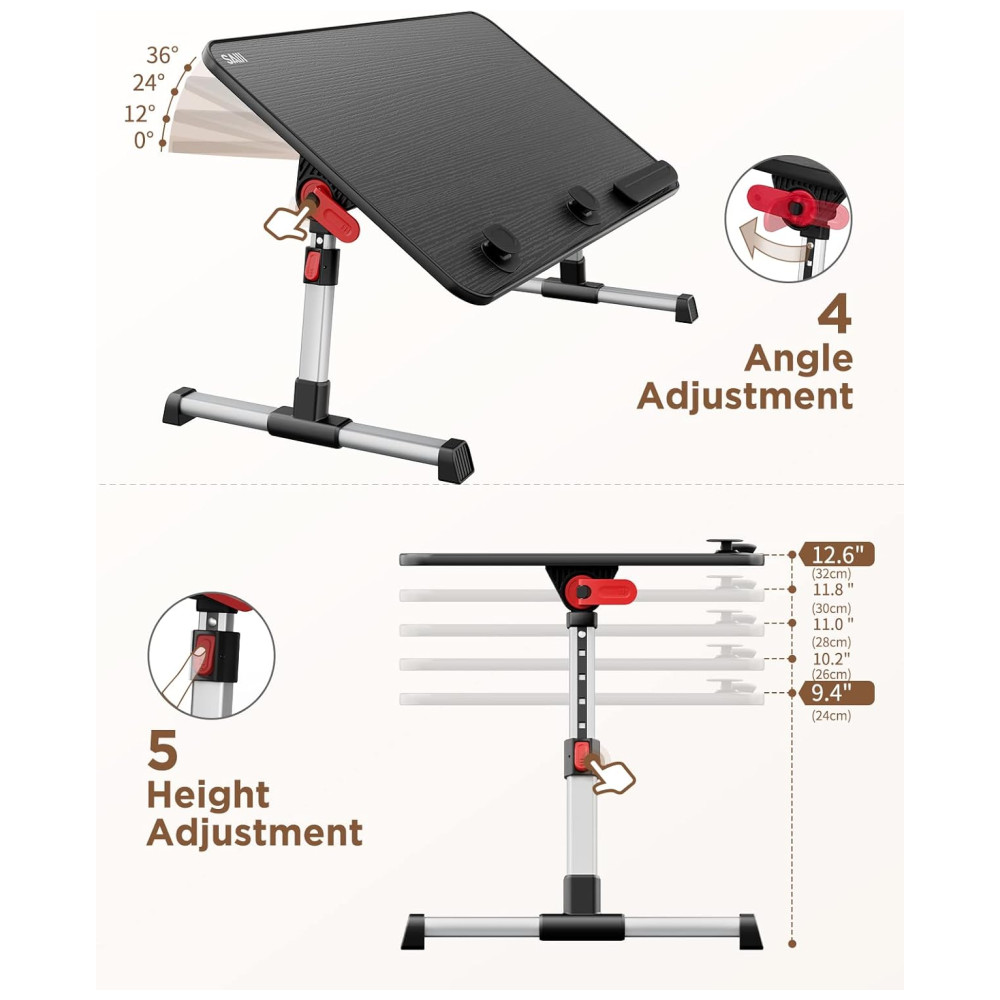 FÁCIL DE USAR Mesa para laptop ajustável Dois botões de bloqueio automático em cada lado permitem facilmente mudanças rápidas na altura, as pernas podem ser definidas para 5 alturas diferentes ajustável de 9,4 12,6, além de duas braçadeiras podem ser usadas para ajustar o ângulo da superfície, a superfície pode ser ajustada para 4 ângulos diferentes de 0 36 .