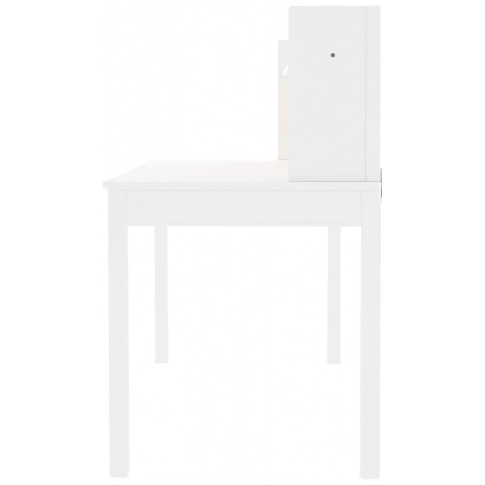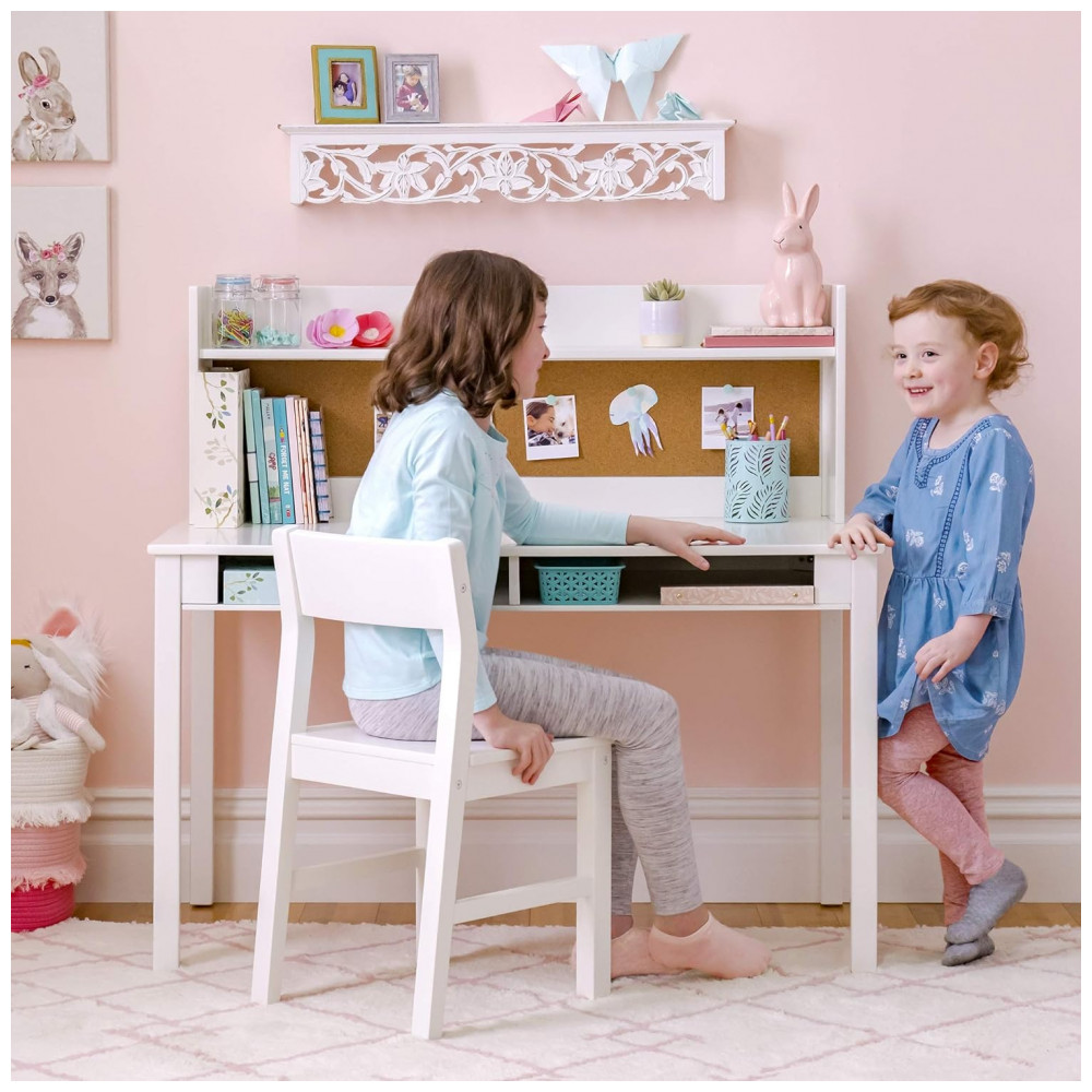 A mesa de estudo infantil Martha Stewart por Guidecraft é um conjunto completo de mobiliário em madeira de bétula combinada com engineered wood, apresentando acabamento branco creme resistente e bordas arredondadas para máxima segurança estrutural. O design inclui superfície de trabalho ampla, nichos de armazenamento aberto, recortes para cabos e tampa de cortiça na parte superior do armário, otimizando organização de materiais escolares e acessórios.