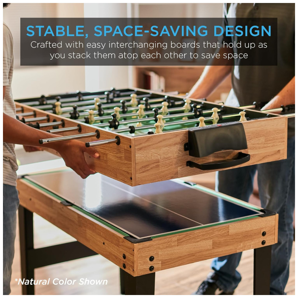 A mesa de jogos versátil 10 em 1 é a escolha ideal para quem procura diversão em família e com amigos. Com uma variedade de 10 jogos diferentes, incluindo hóquei de mesa, pebolim, bilhar, shuffleboard, tênis de mesa, xadrez, cartas, damas, boliche e gamão, todos encontrarão algo para se divertir. O design inteligente da mesa economiza espaço, permitindo que todas as superfícies sejam empilhadas entre a base de bilhar e a mesa de pebolim, o que a torna perfeita para colocar no quarto das crianças ou em uma sala de jogos extra.