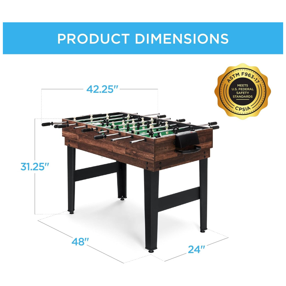 As dimensões gerais da mesa são 121,92 cm de comprimento, 60,96 cm de largura e 79,38 cm de altura, proporcionando um tamanho adequado para diversas configurações de sala. Esta mesa não apenas oferece uma ampla gama de opções de entretenimento, mas também é uma adição funcional e divertida para qualquer espaço dedicado ao lazer em casa.