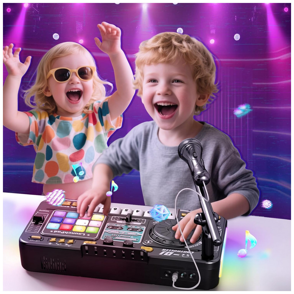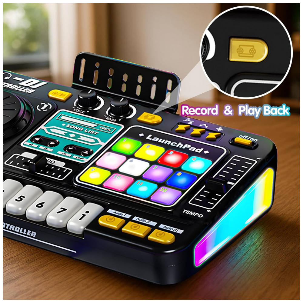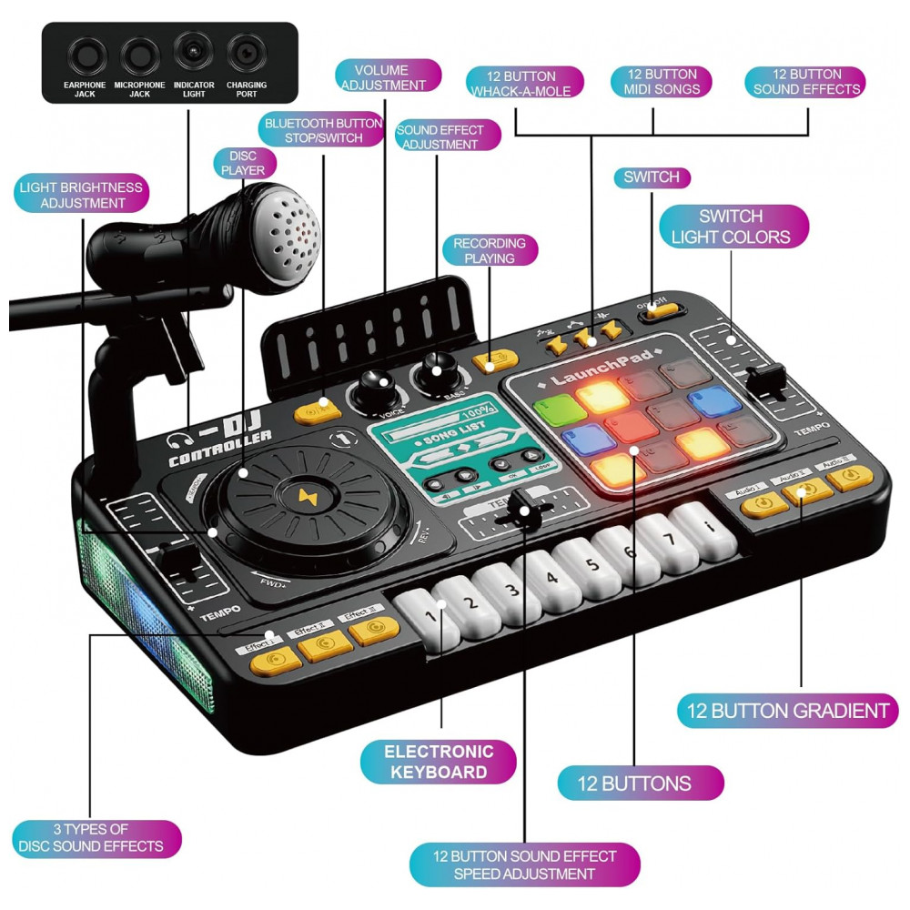 A mesa DJ mixer musical infantil Tsomtto é um brinquedo eletrônico que combina teclado de piano, discos de DJ, efeitos sonoros e painel com luzes LED dinâmicas para atividades musicais e de ritmo. O brinquedo incorpora 12 músicas pré-programadas em estilo MIDI, funções de efeitos de DJ, teclas de piano, mesa giratória, jogo tipo “acertar o alvo” e entrada para microfone, criando um centro de atividades musicais para crianças. O painel permite ajustes de luz, reprodução de sons, gravação simples e conexão a dispositivos externos via USB para ampliar as possibilidades de uso.