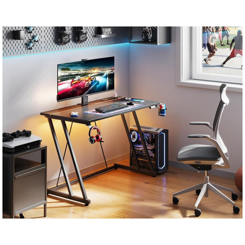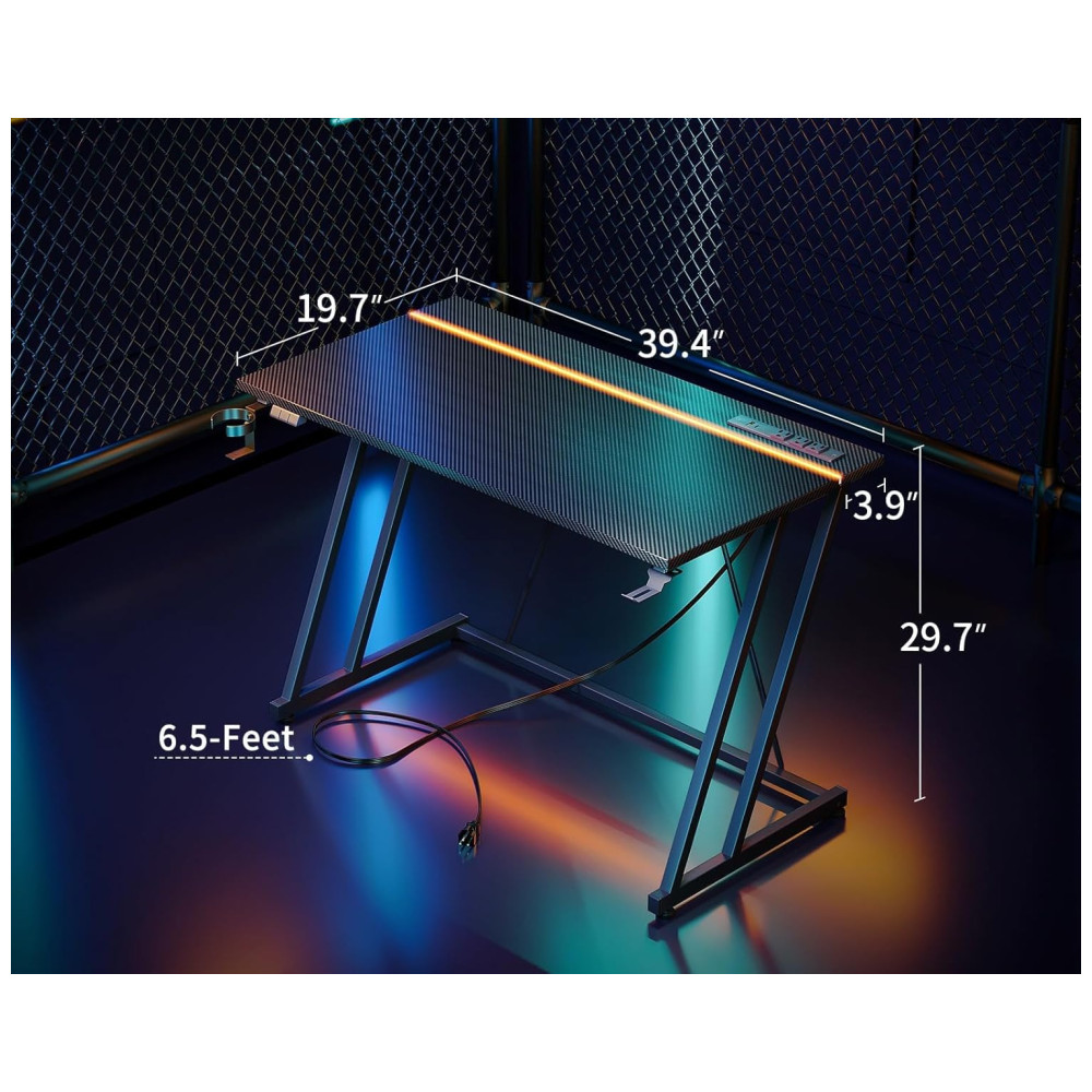 Mesa Gamer 39″ 99 cm com Textura de Fibra de Carbono Gancho para Fone de Ouvido Tomadas 1 Portas USB e Luz LED 110V MOTPK Preto
