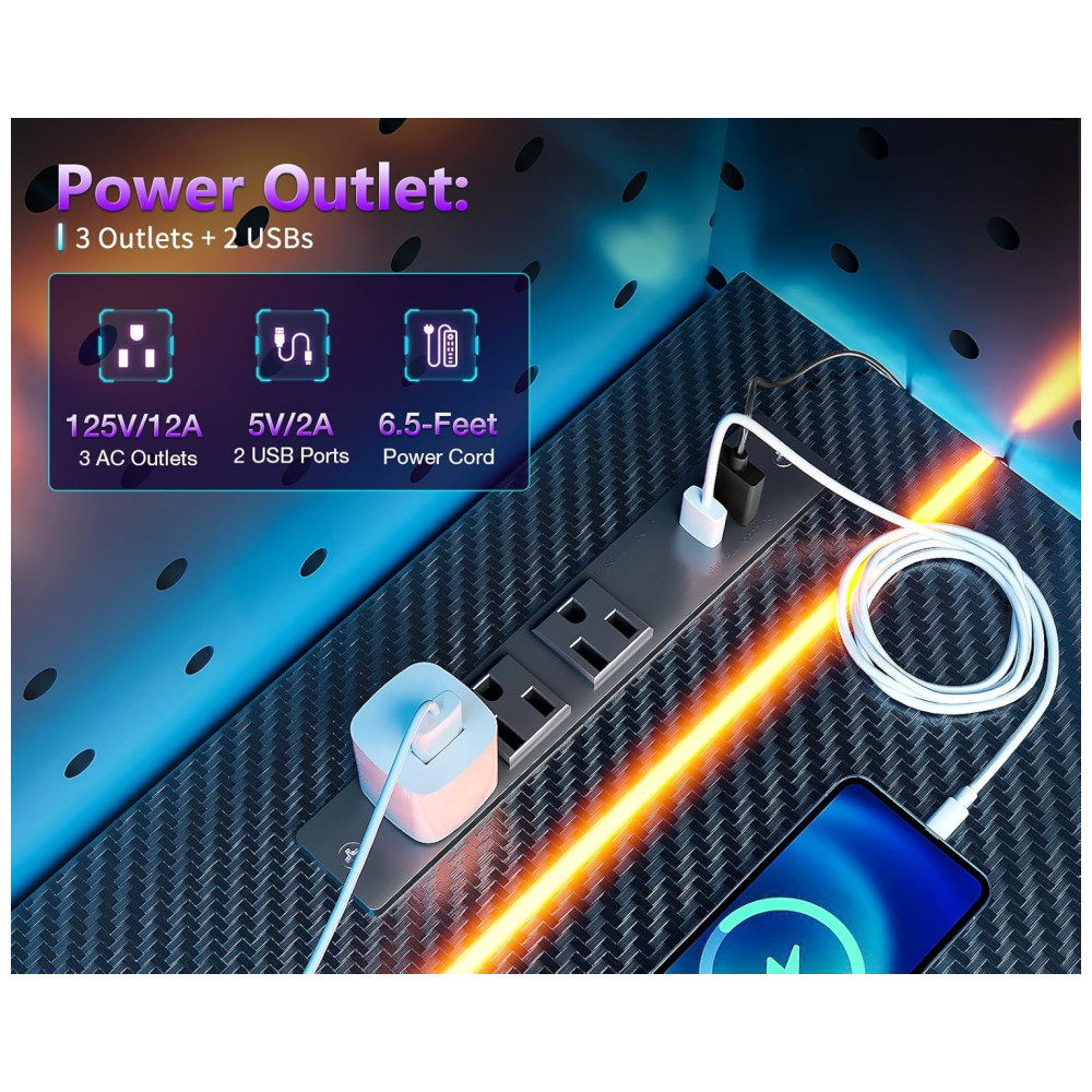 Além disso, a mesa inclui uma tomada embutida com 3 tomadas elétricas, 1 porta USB e 1 porta Tipo C, facilitando o carregamento dos seus dispositivos enquanto joga.