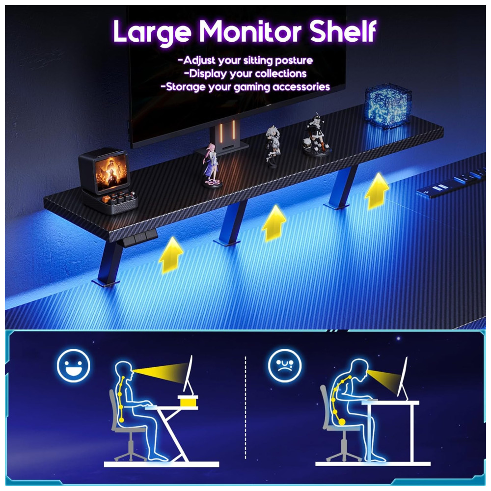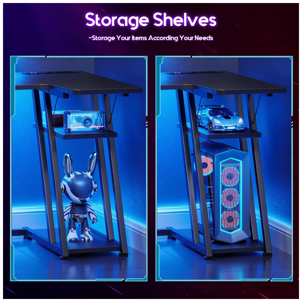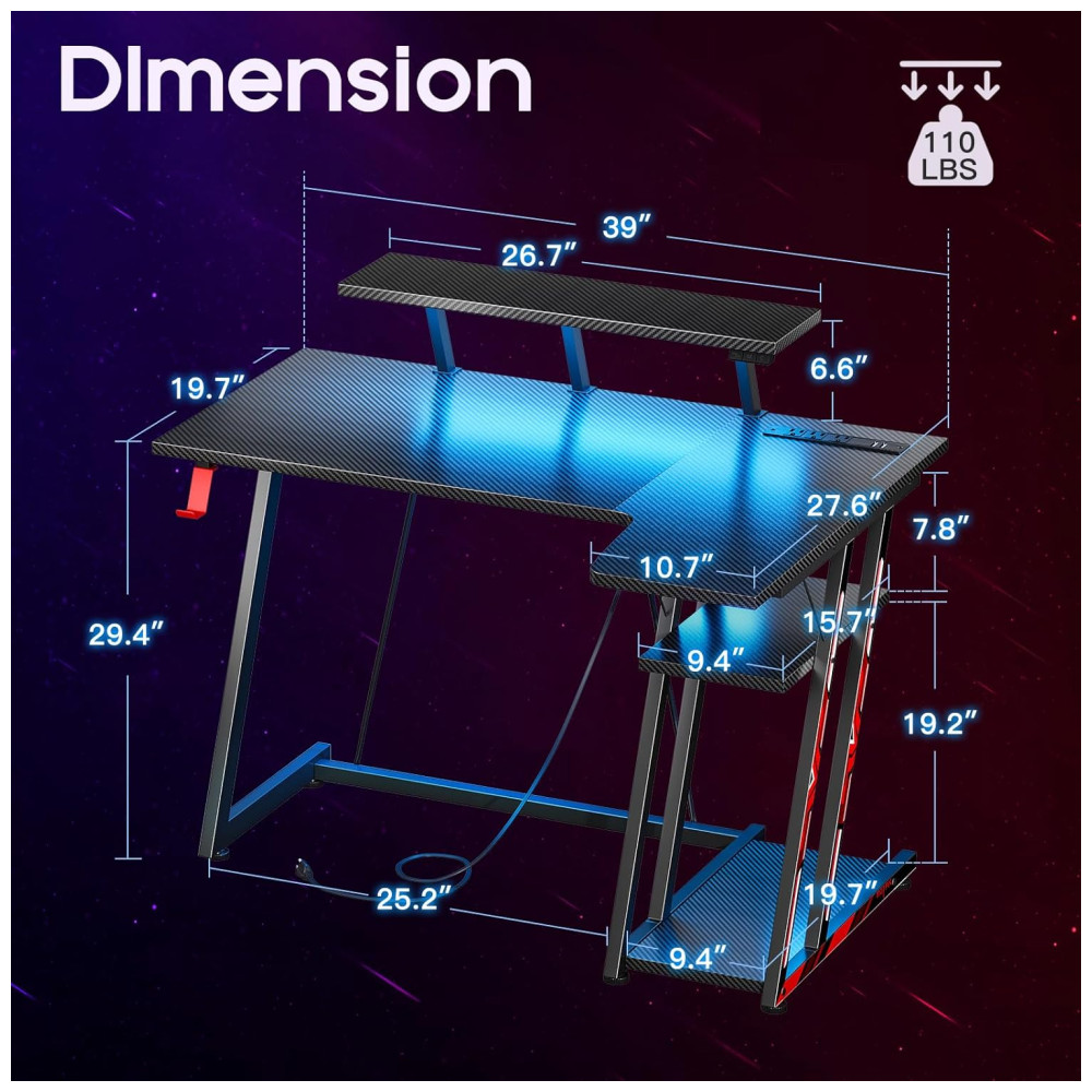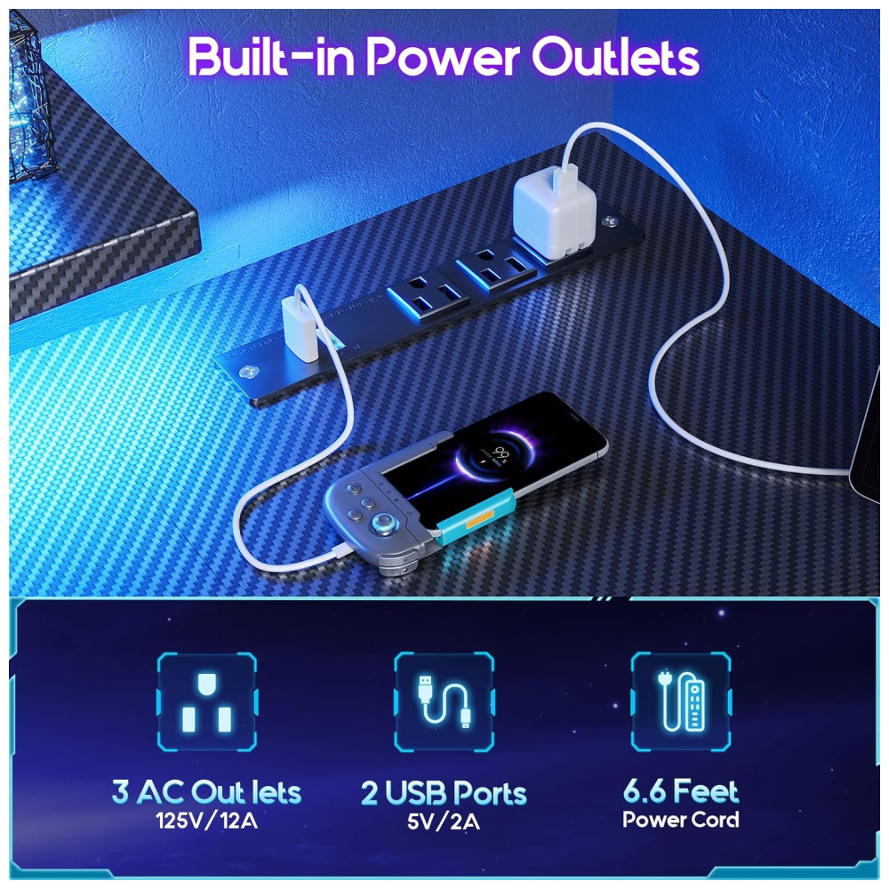Mesa Gamer de Fibra de Carbono 39″ 100 cm com Gancho para Fone de Ouvido 2 Tomadas 2 Portas USB Luz LED e Suporte para Monitor 110V MOTPK Preto