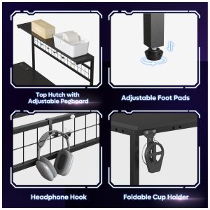 Projetada para estabilidade e praticidade, a mesa Bestier vem com almofadas ajustáveis para os pés e uma estrutura de aço triangular para suporte adicional. As prateleiras podem ser instaladas em ambos os lados da mesa, oferecendo flexibilidade e conveniência. A instalação é simples, com um guia fácil de entender que permite configurar seu espaço de jogo sem esforço e sem a necessidade de ferramentas complexas ou habilidades profissionais.