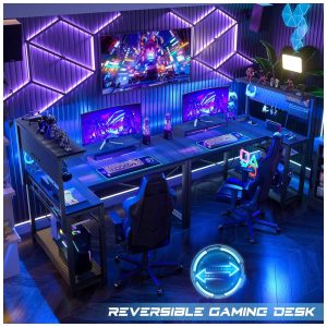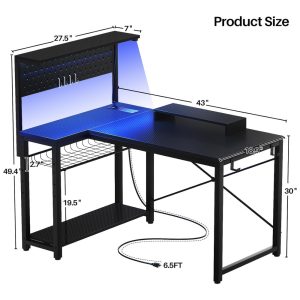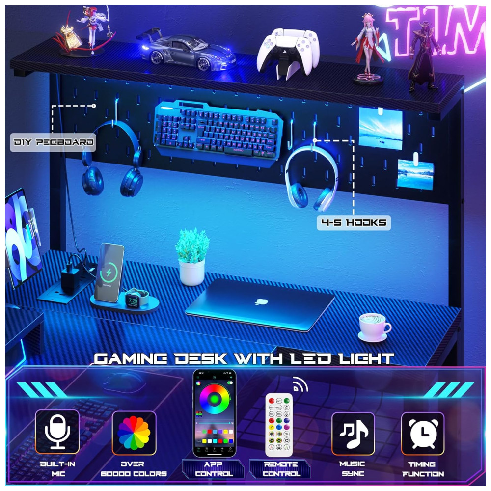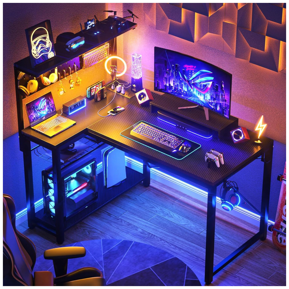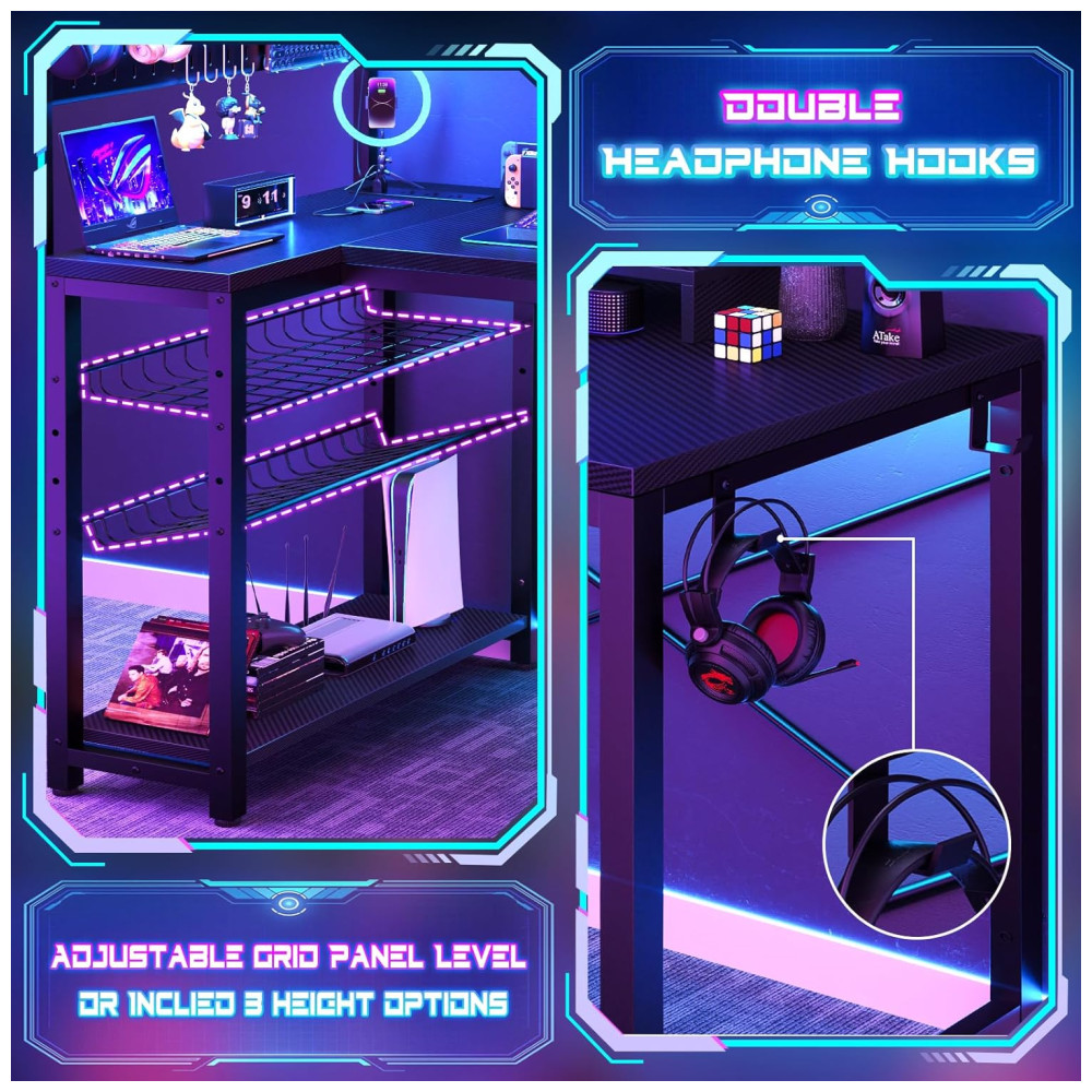 Mesa Gamer de Fibra de Carbono em Formato de L 43″ 109 cm com Luz LED Suporte para Monitor Tomadas Ganchos para Fone de Ouvido e Mesa de Canto Reversível 110V Homieasy Preto