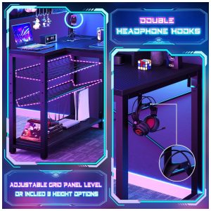 Você pode controlar a iluminação LED tanto pelo controle remoto de 24 teclas quanto pelo aplicativo inteligente. Além disso, a mesa possui um painel perfurado DIY e ganchos 4S para organizar seus fones de ouvido, teclado para jogos e outros acessórios. Os painéis perfurados de metal suportam ganchos, pinos, suportes e prateleiras, garantindo uma organização eficiente e um ambiente de jogo mais limpo.