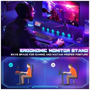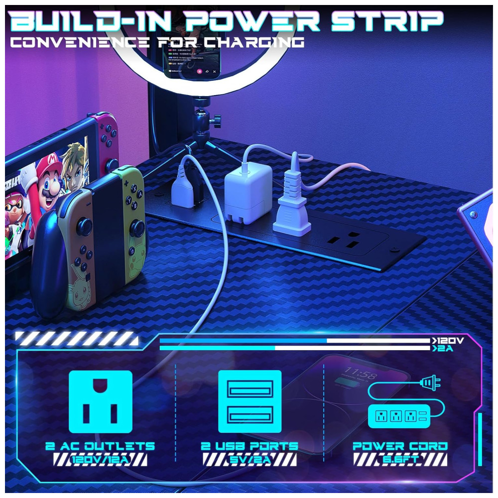 A mesa também conta com uma estação de carregamento integrada, equipada com 3 tomadas e 2 portas USB, permitindo carregar seu console de jogos, laptop, tablet, smartphone e outros dispositivos com facilidade. O suporte de monitor removível oferece uma visualização confortável e ajuda a economizar espaço na mesa.