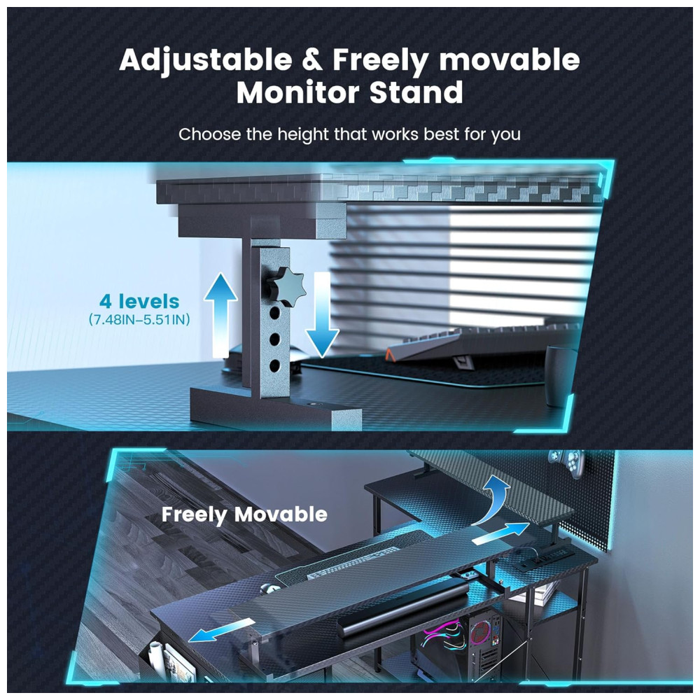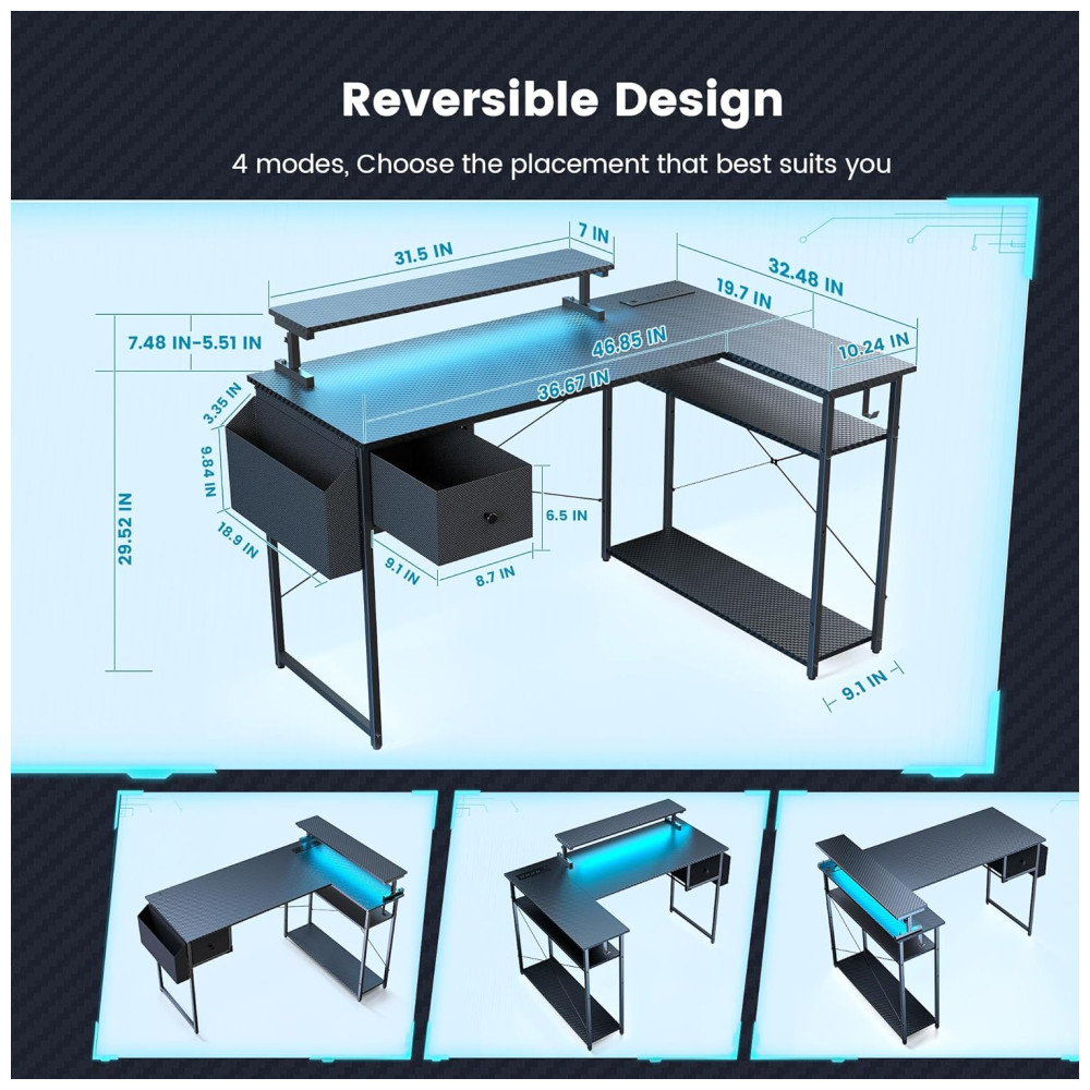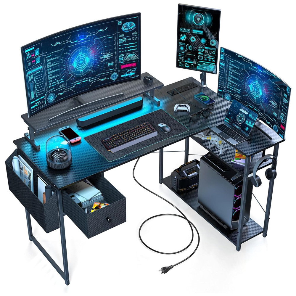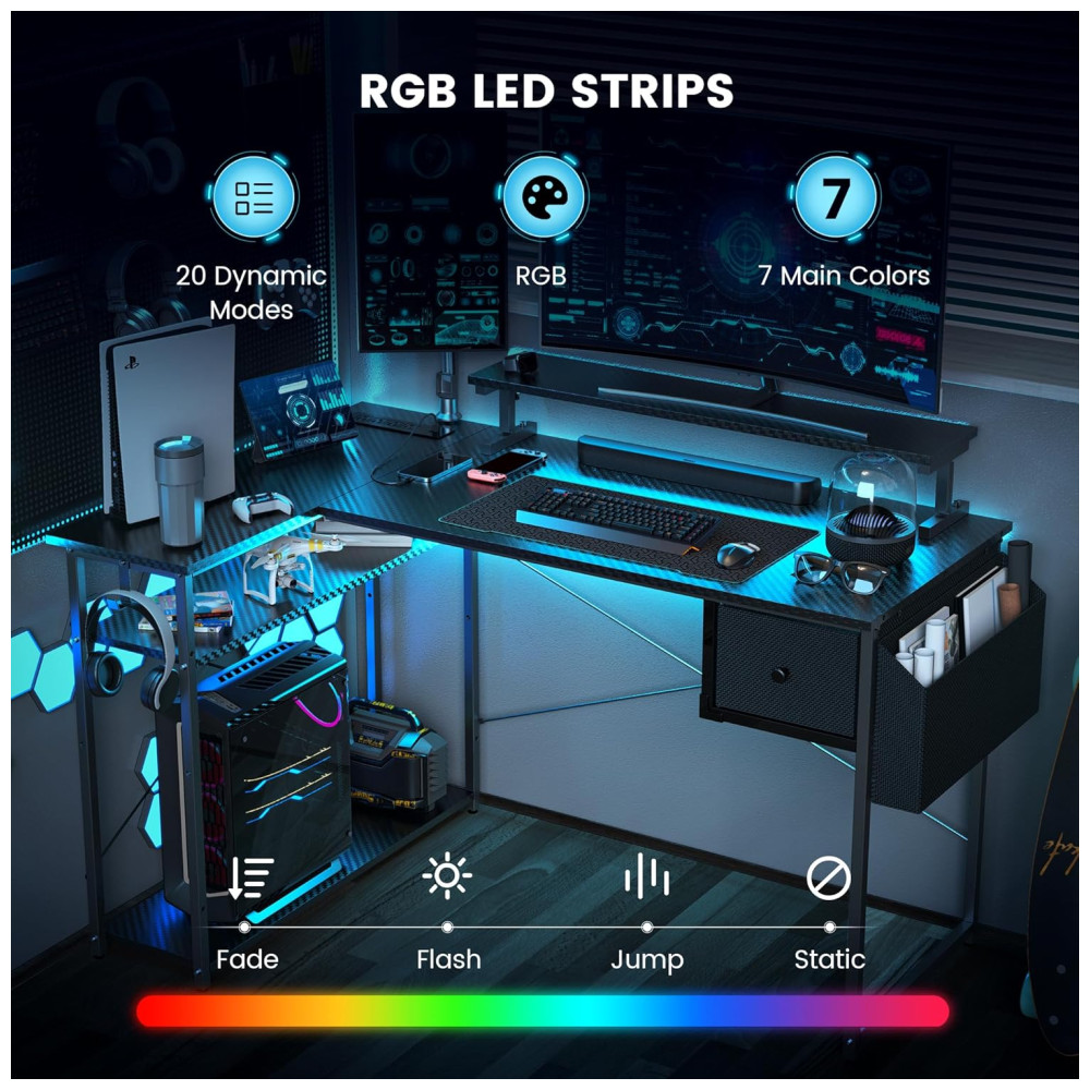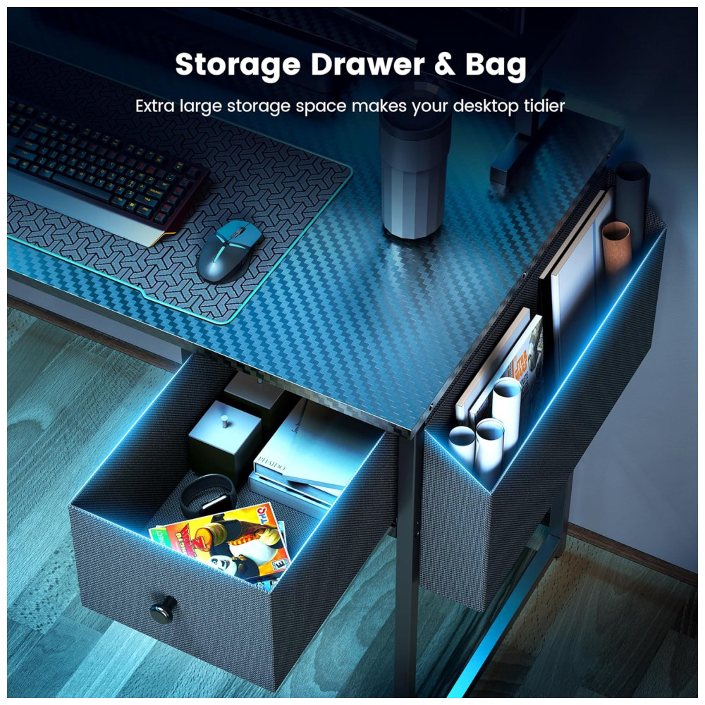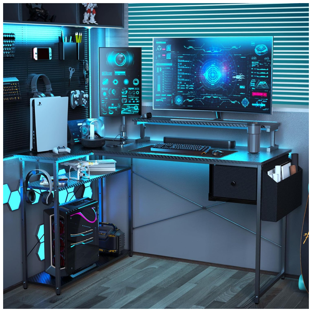 Mesa Gamer de Fibra de Carbono em Formato de L 47″ 119 cm com Prateleiras Tomadas Gaveta e Luz LED 110V DOMICON Preto