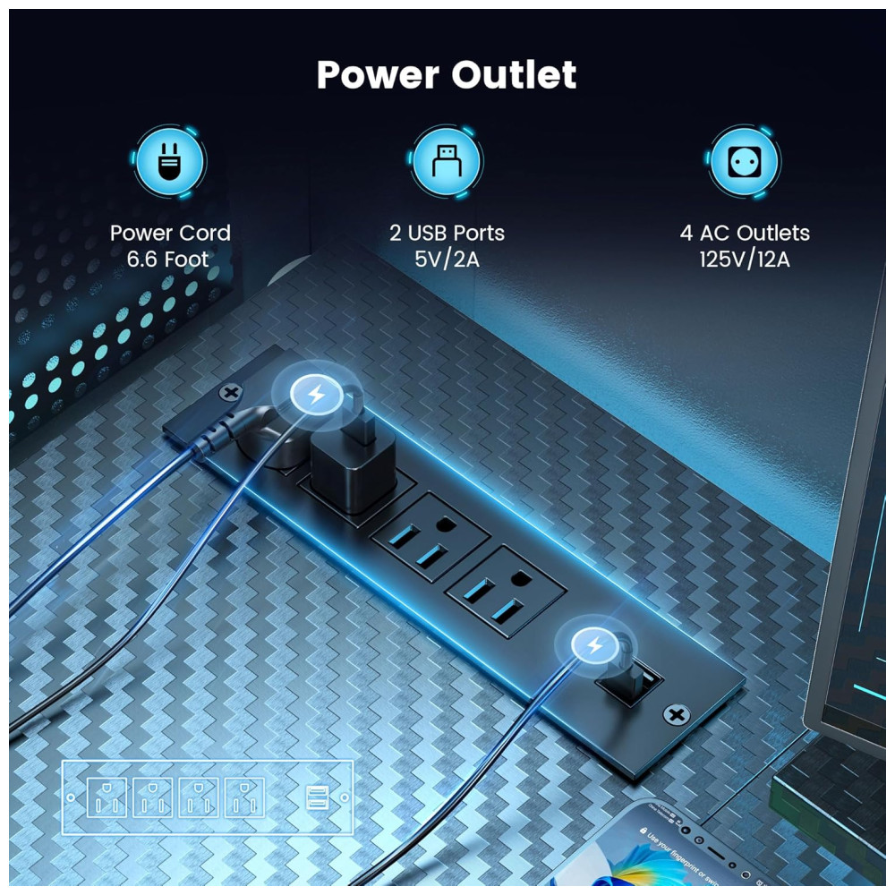 Além disso, a mesa possui 4 tomadas elétricas CA e 2 portas USB, facilitando o carregamento de diversos dispositivos eletrônicos durante jogos ou trabalho em casa. Para armazenamento, ela inclui uma gaveta ampliada para artigos de papelaria, materiais de escritório e iPad, um bolso lateral grande para documentos e revistas, e duas prateleiras laterais para suprimentos de escritório, jogos e hosts de computador.