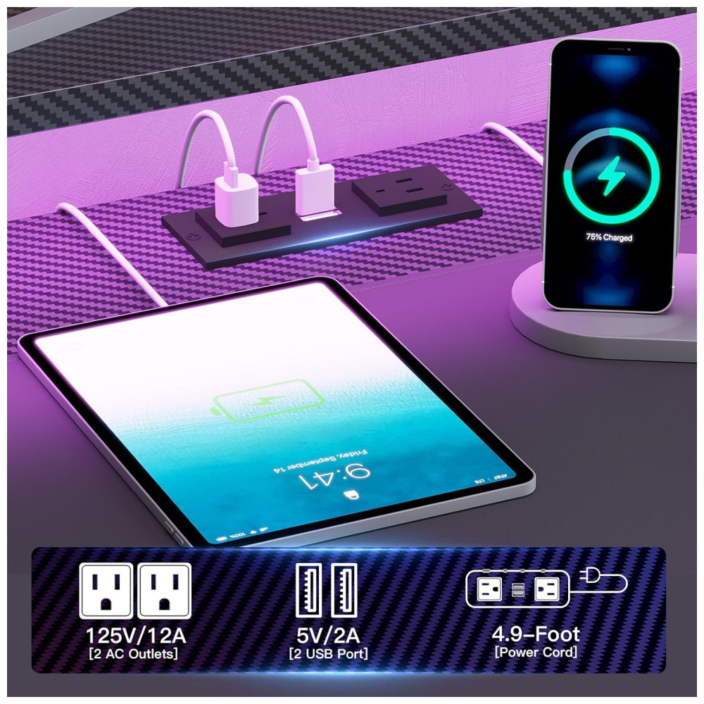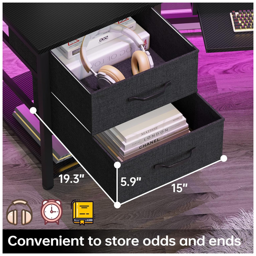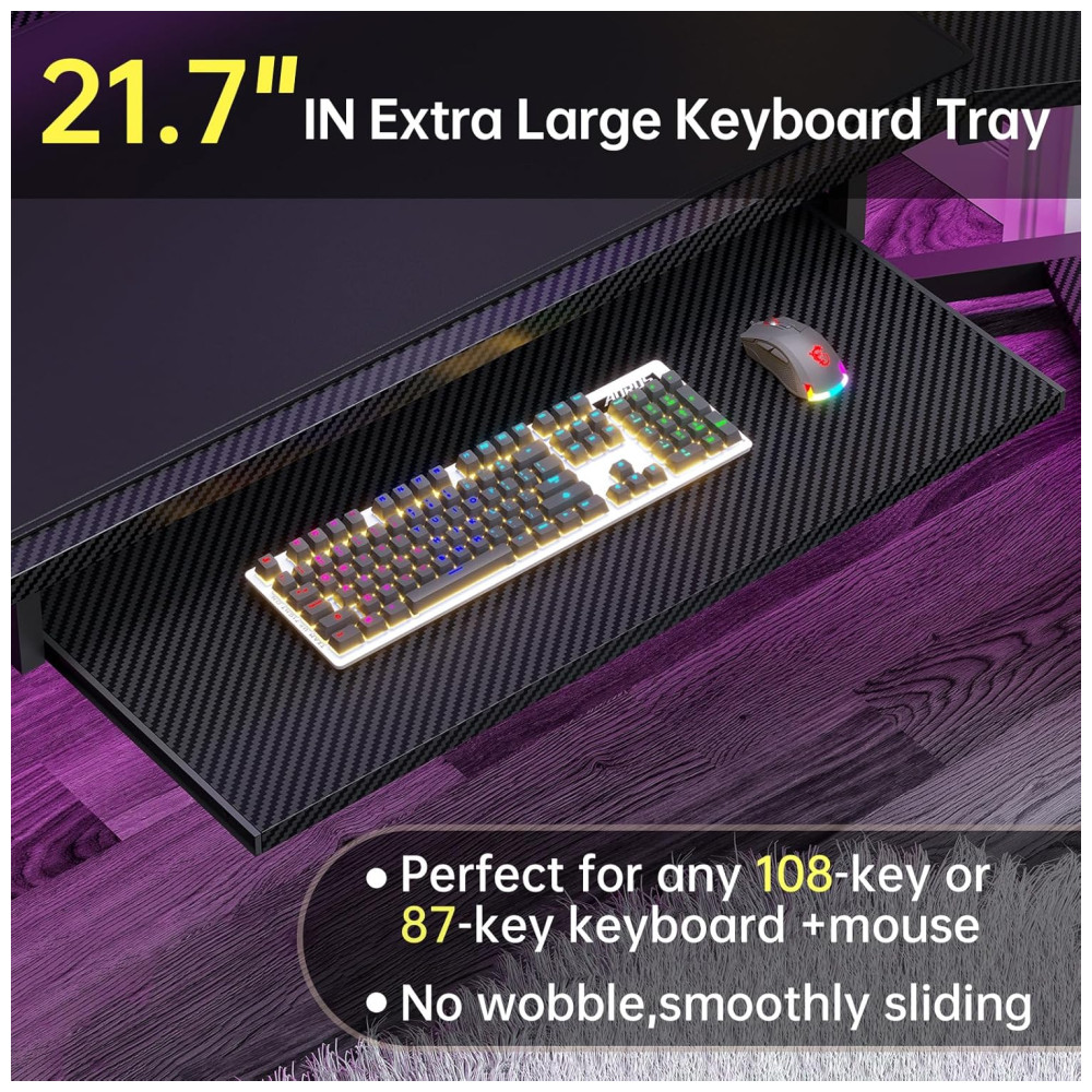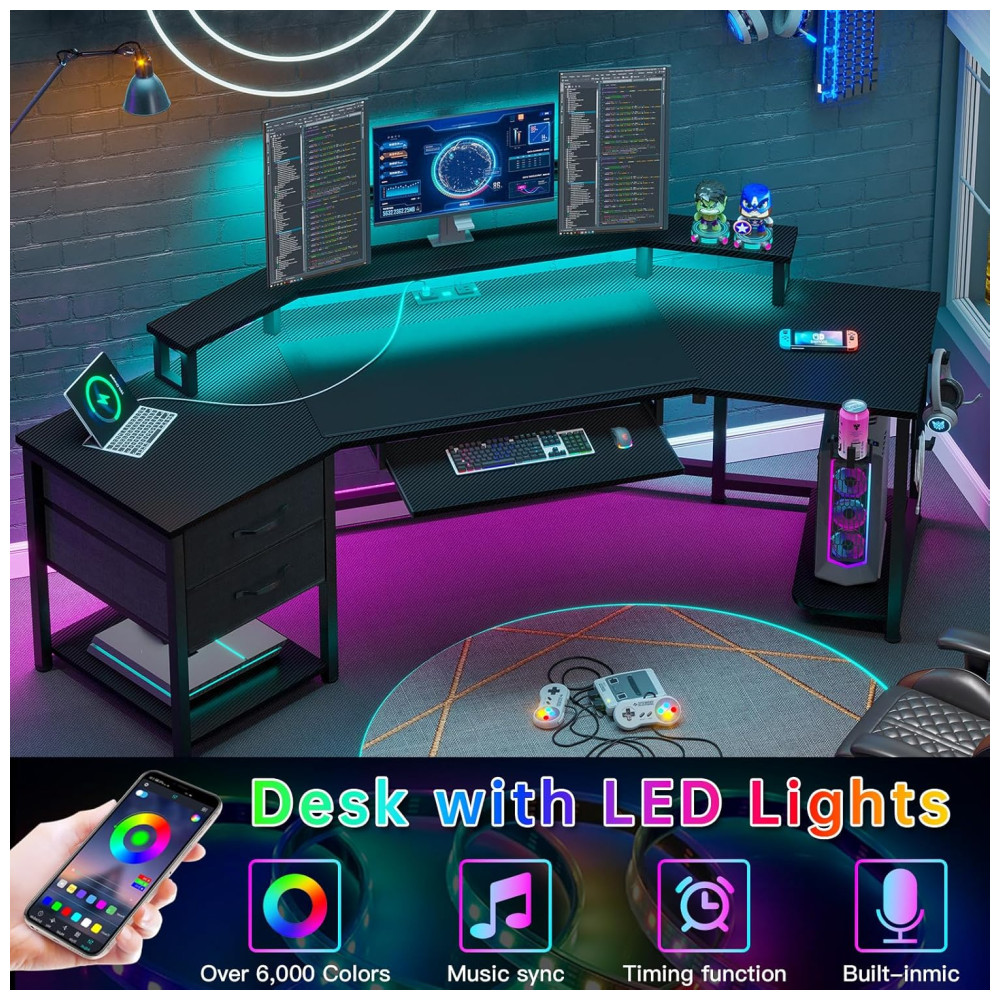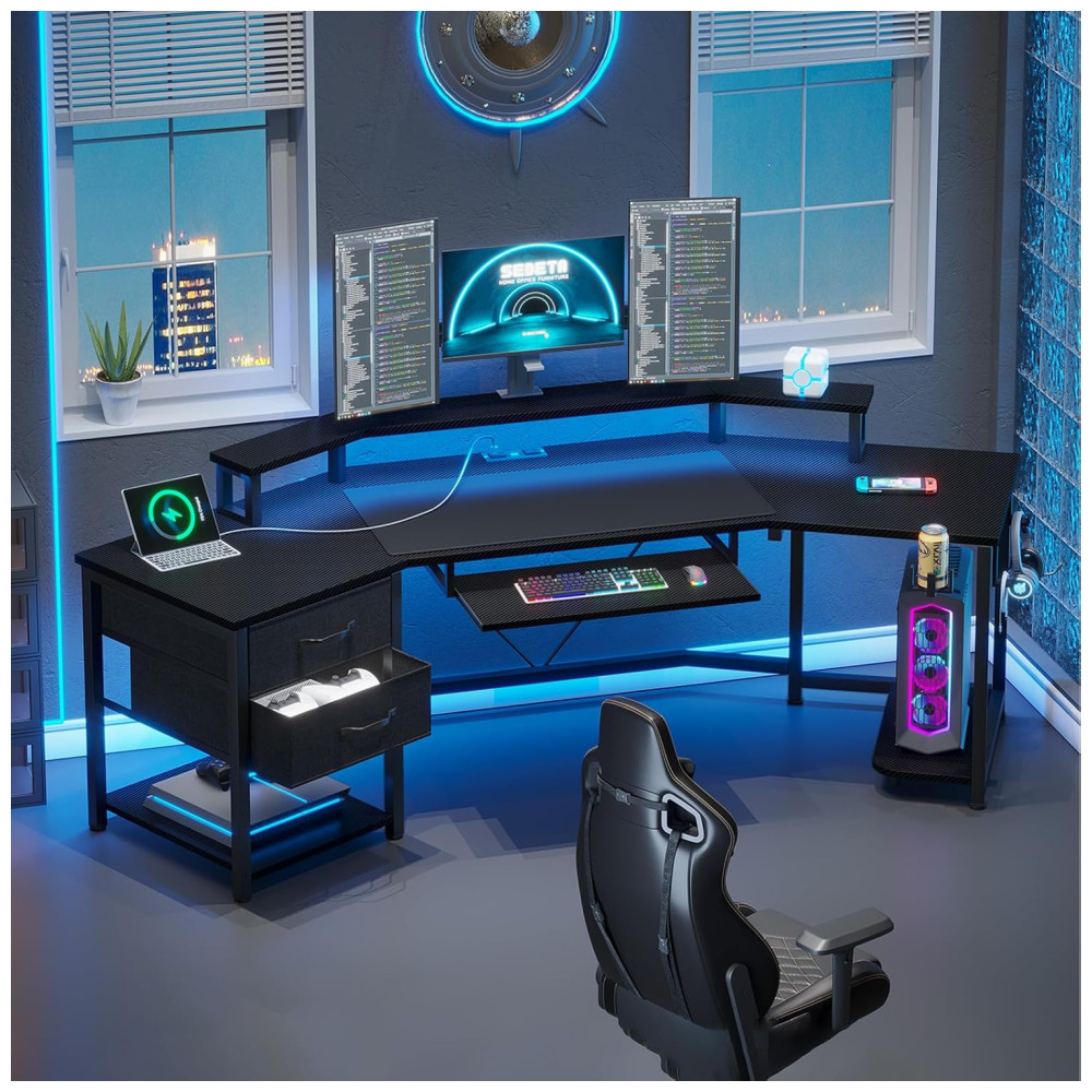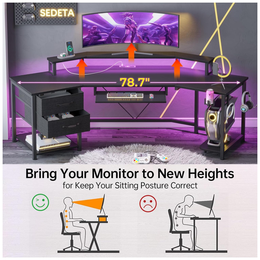 Mesa Gamer de Fibra de Carbono em Formato de L 79″ 200 cm com Luz LED Suporte para Monitor Porta-Copos Tomadas e 2 Gavetas 110V SEDETA Preto