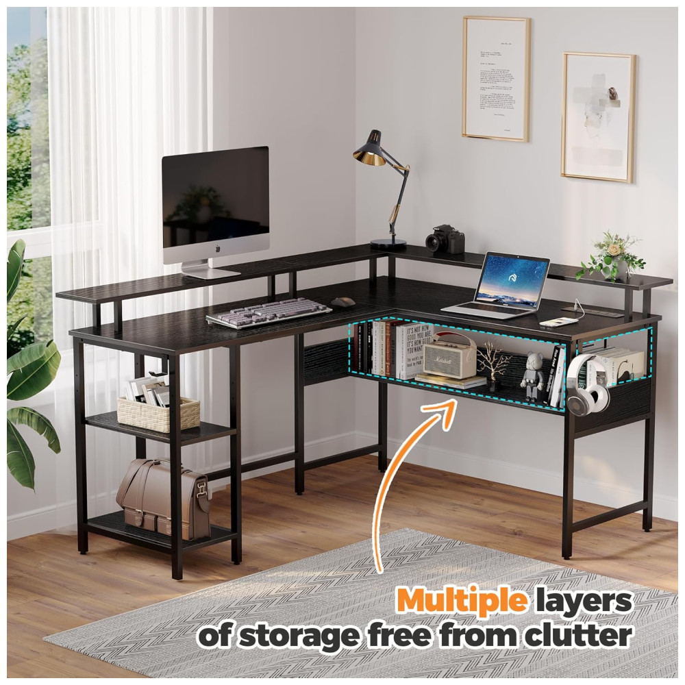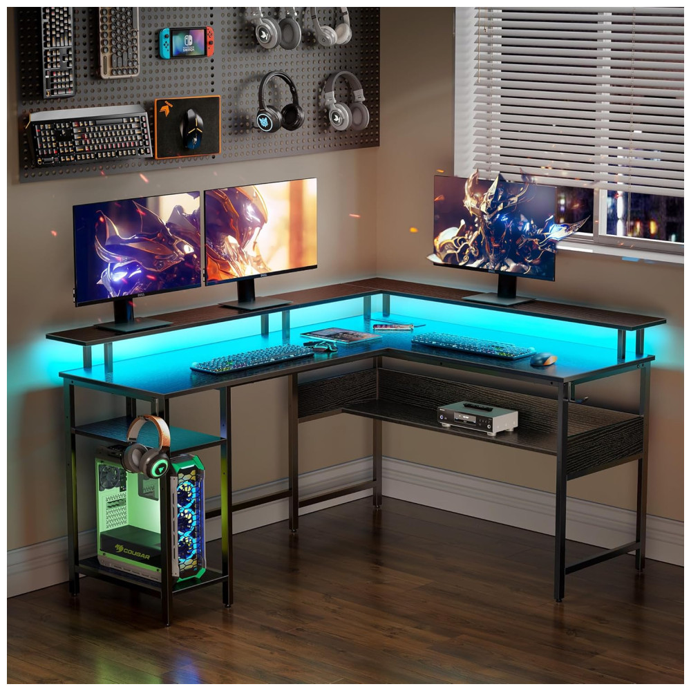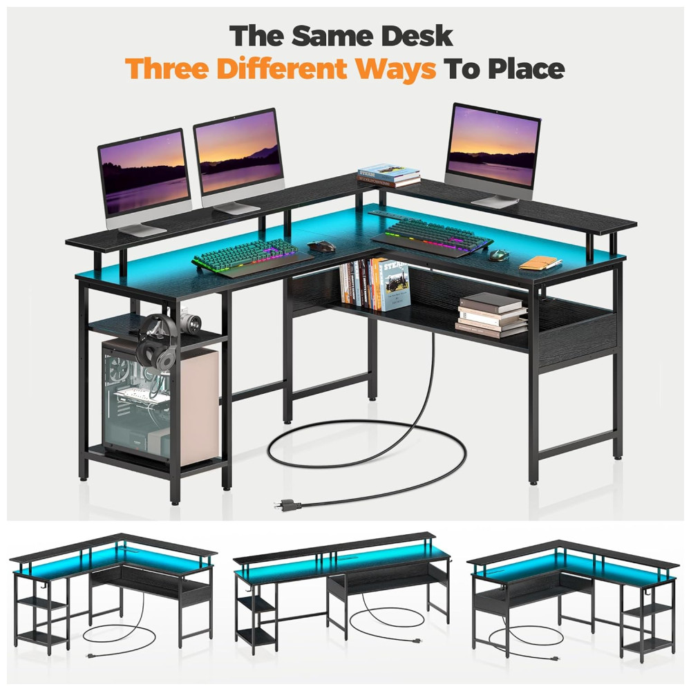 Mesa Gamer em Formato de L 56.7″ 144 cm com Ganchos para Fones de Ouvido Luz LED Tomadas e Suporte para Monitor 110V Rolanstar CPT016-RG Preto