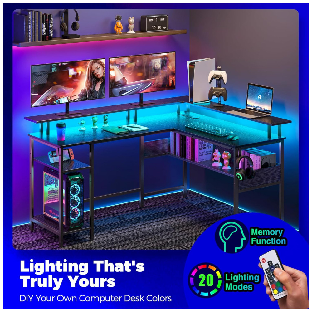 A Mesa em L com luzes LED é a escolha perfeita para quem busca versatilidade e funcionalidade. Equipado com luzes LED que oferecem 20 cores e 21 modos dinâmicos, o controle remoto de 17 teclas permite personalizar a iluminação do ambiente conforme suas preferências. A função de memória das luzes LED mantém a configuração no último modo selecionado quando a mesa é ligada.