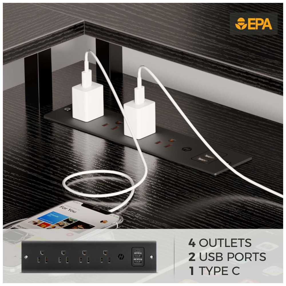 Além das luzes LED, a mesa vem com uma régua de energia integrada, que inclui 4 tomadas, 2 portas USB e 1 porta Tipo C, facilitando o carregamento de seus dispositivos eletrônicos. Um gancho para fones de ouvido mantém seus acessórios sempre à mão, proporcionando ainda mais conveniência.