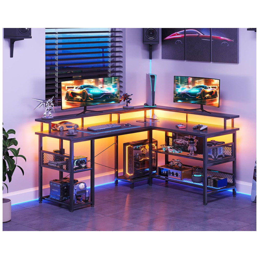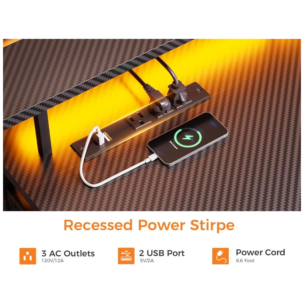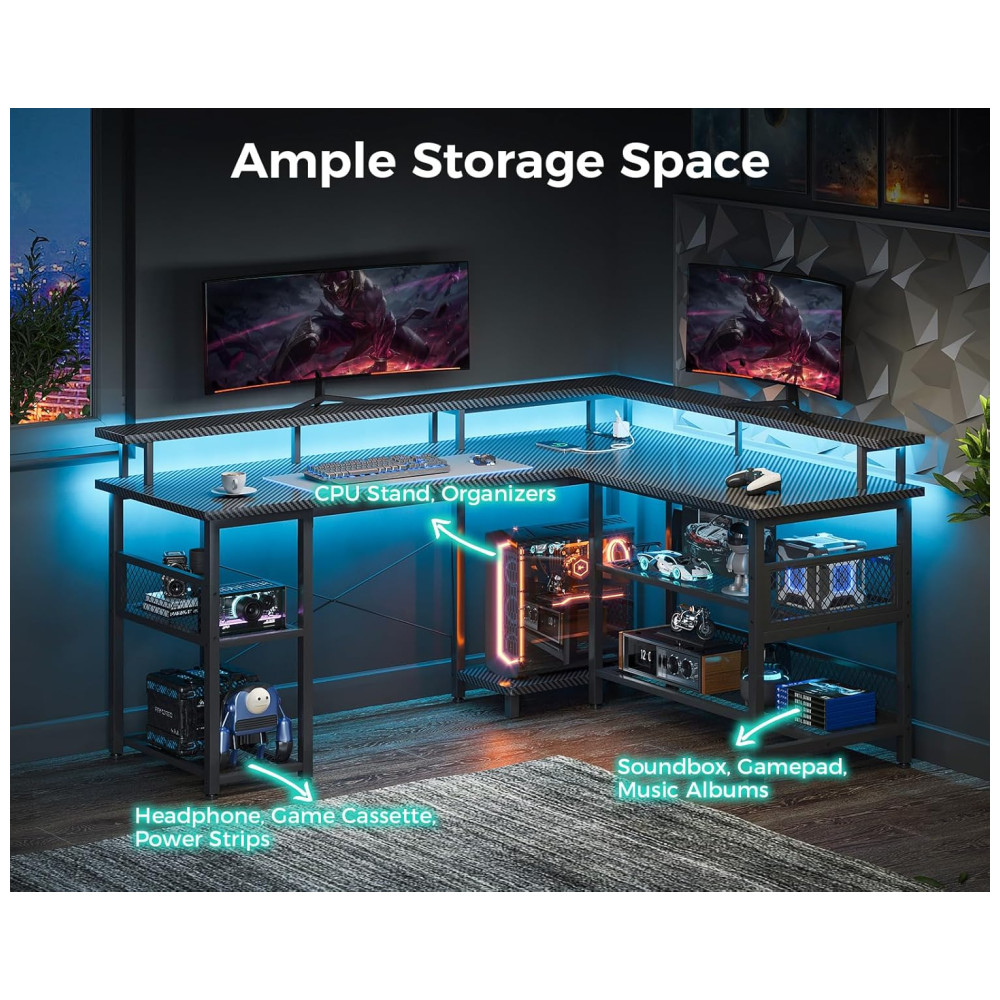 Mesa Gamer em Formato de L 59″ 150cm em Fibra de Carbono com Prateleiras de Armazenamento Suporte para Monitor Tomadas e Luz LED 110V ODK Preto