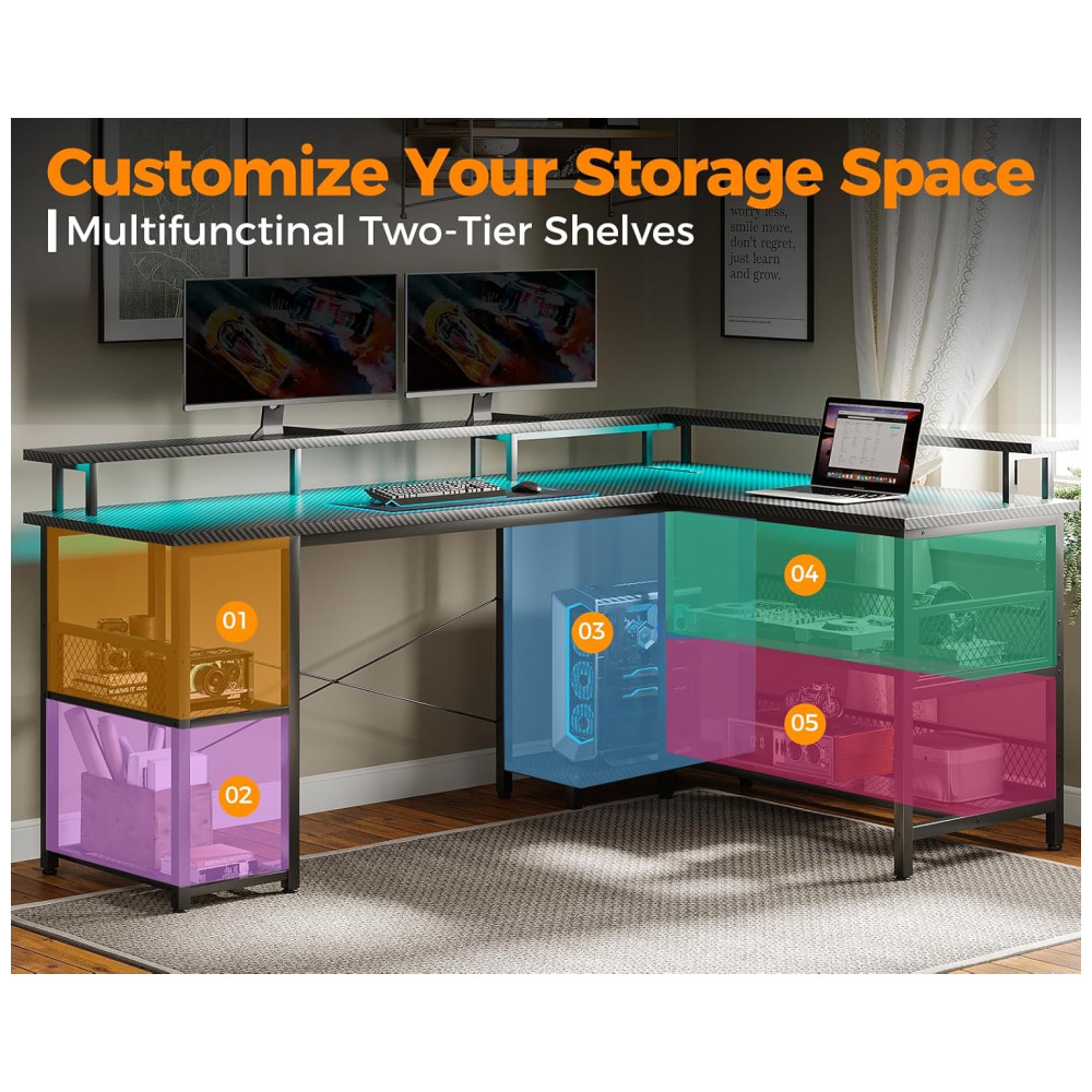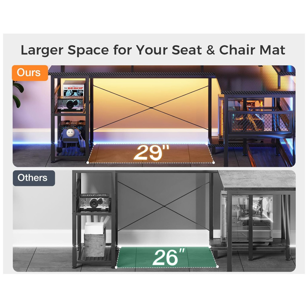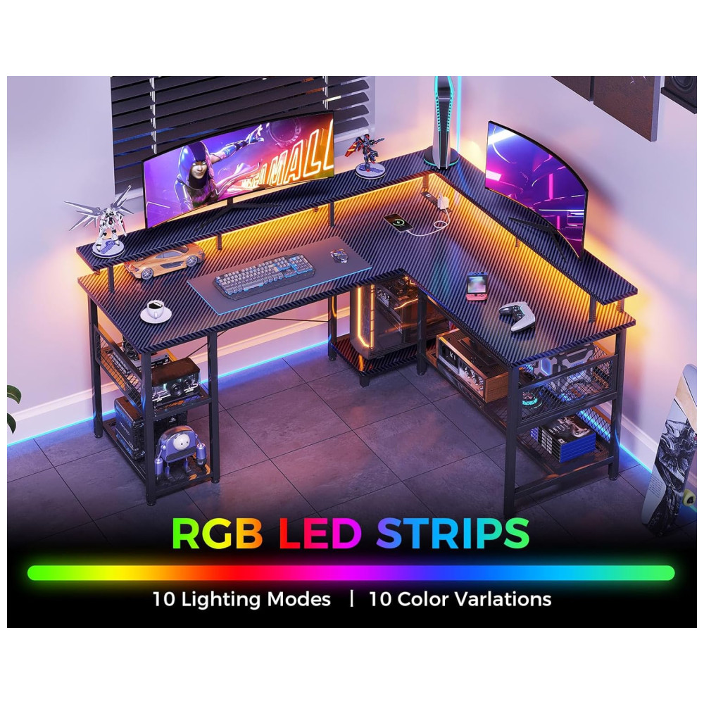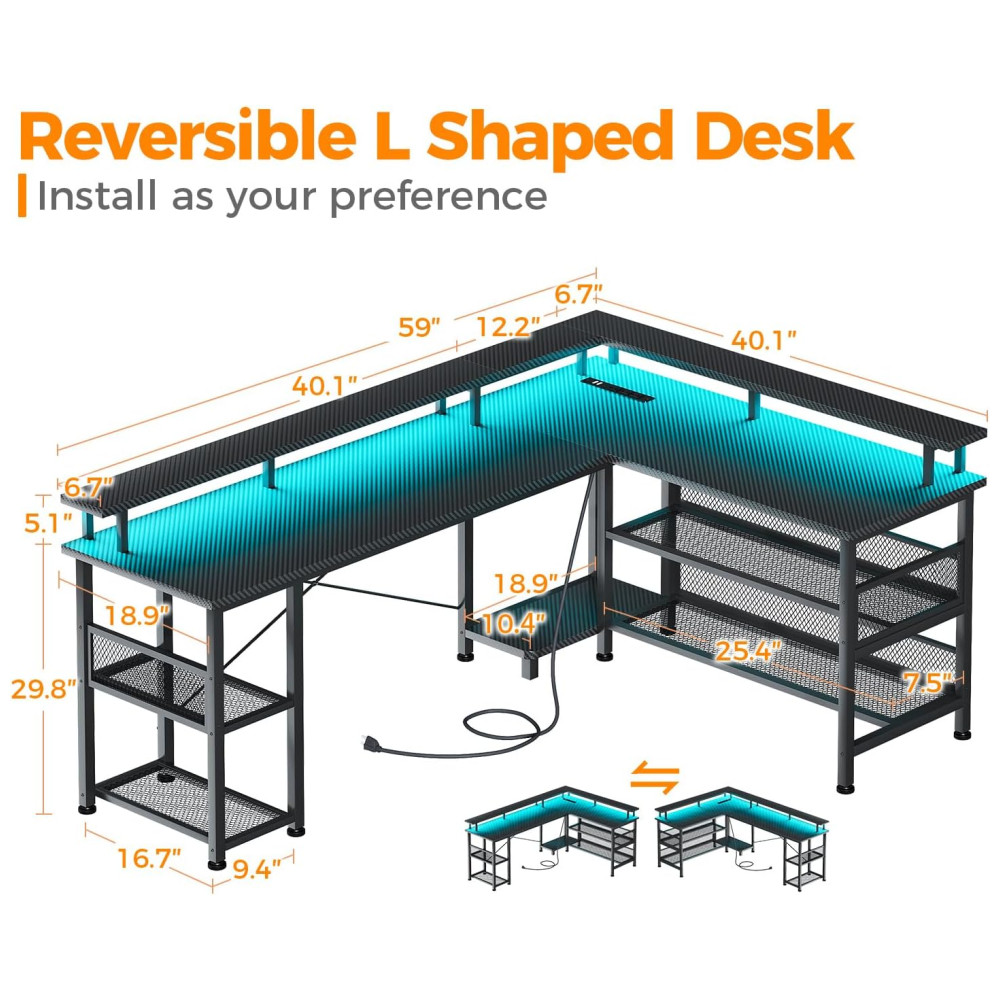 Mesa Gamer em Formato de L 59″ 150cm em Fibra de Carbono com Prateleiras de Armazenamento Suporte para Monitor Tomadas e Luz LED 110V ODK Preto
