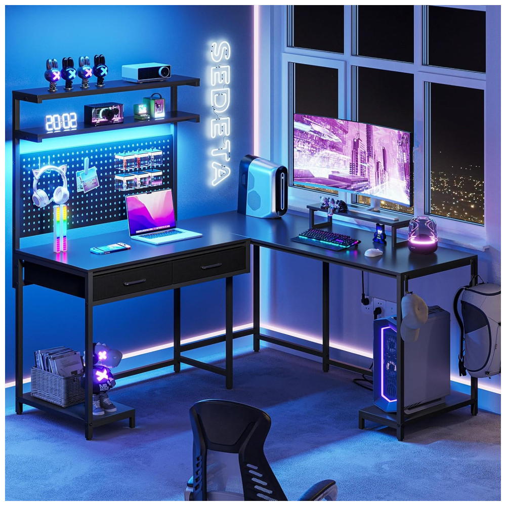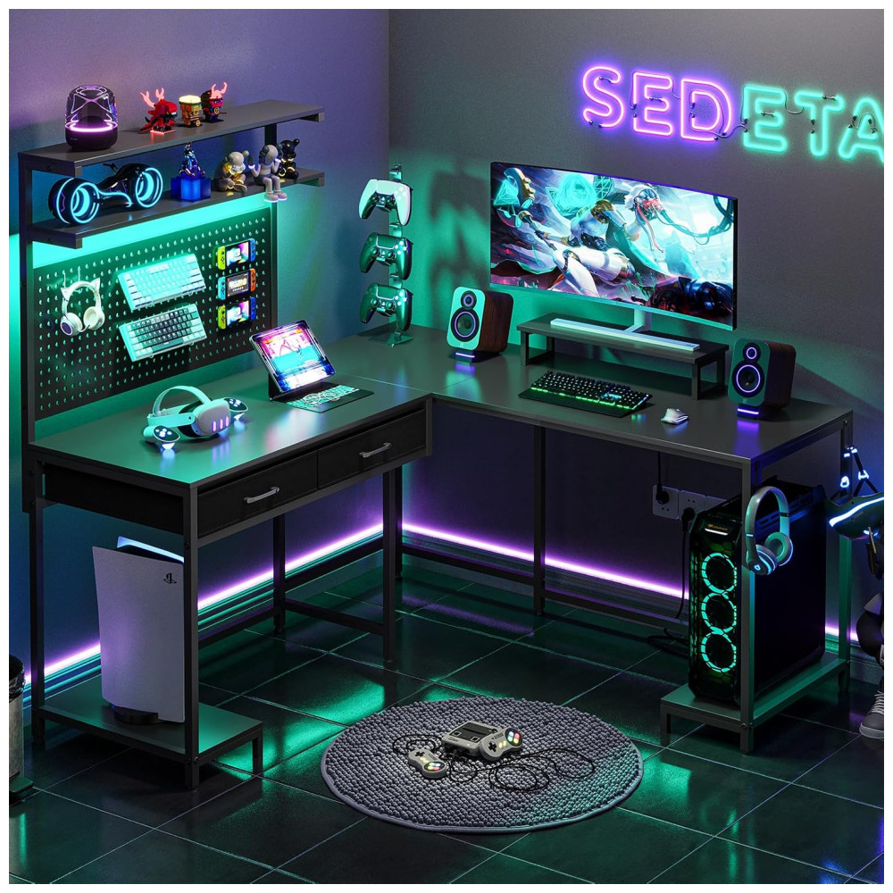 Mesa Gamer em Formato de L com Luz LED Suporte para Monitor Prateleiras de Armazenamento Tomadas Painel Perfurado e Gavetas 110V SEDETA Preto