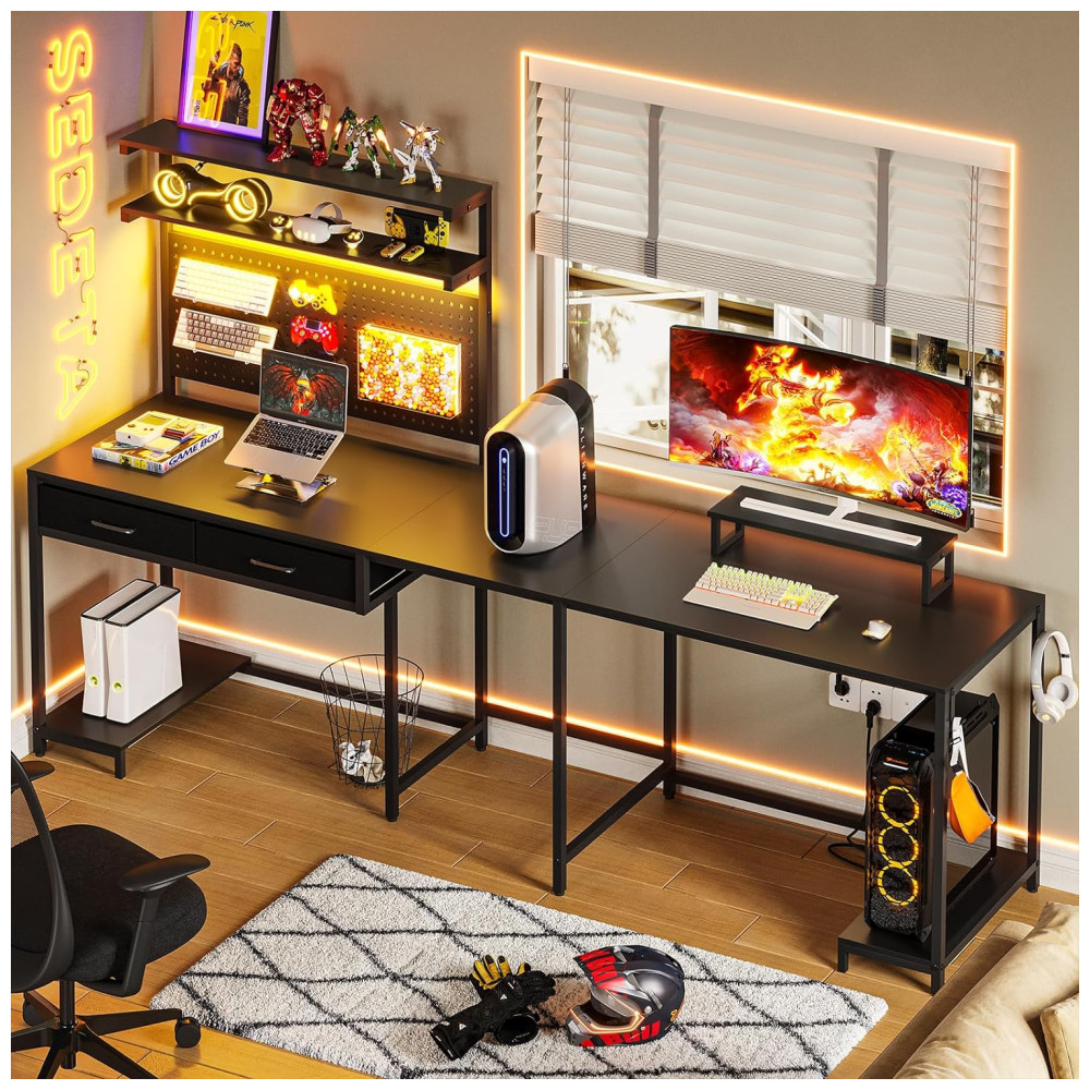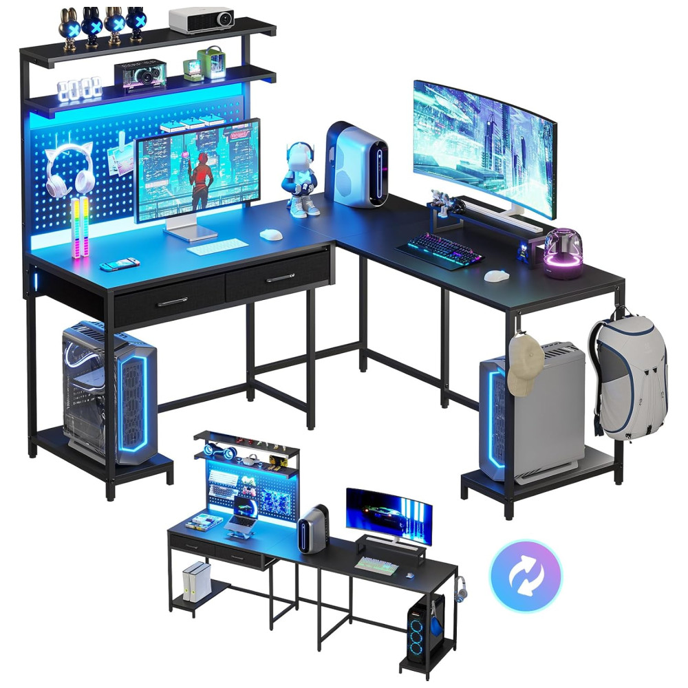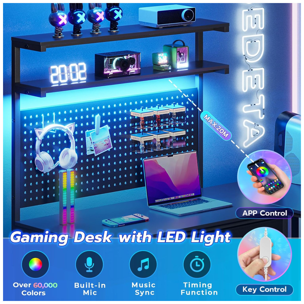 Esta mesa conversível em L, com 89,92 cm de largura, pode ser facilmente transformada em uma mesa para duas pessoas de 227,84 cm, tornando-a ideal tanto para jogos quanto para trabalho. Equipada com luzes LED RGB, a mesa oferece mais de 60.000 cores e 29 modos de piscar, que podem ser controlados via aplicativo para criar uma atmosfera personalizada.
