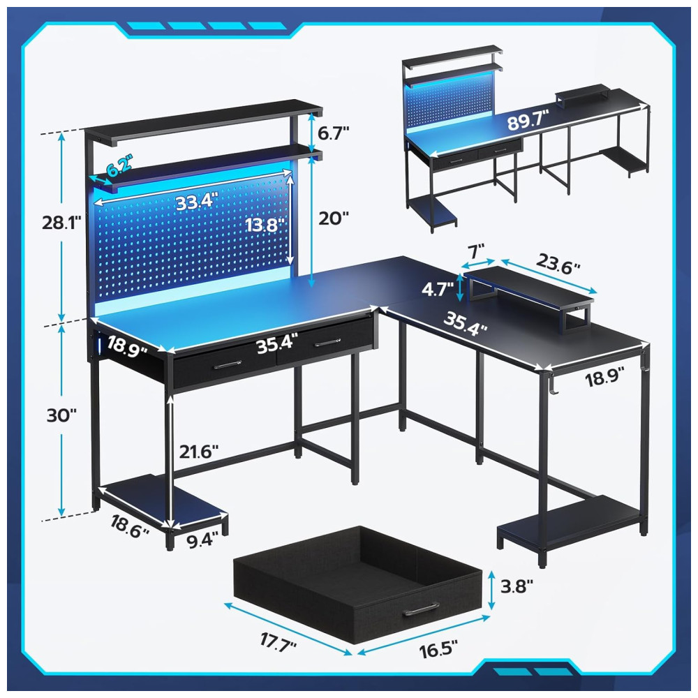 A mesa também conta com duas gavetas de tecido fáceis de montar e é projetada para ser simples de manter e montar, com todas as instruções e hardware incluídos no pacote. Seu formato em L acomoda facilmente teclado, mouse e acessórios, proporcionando um amplo espaço para um setup eficiente.