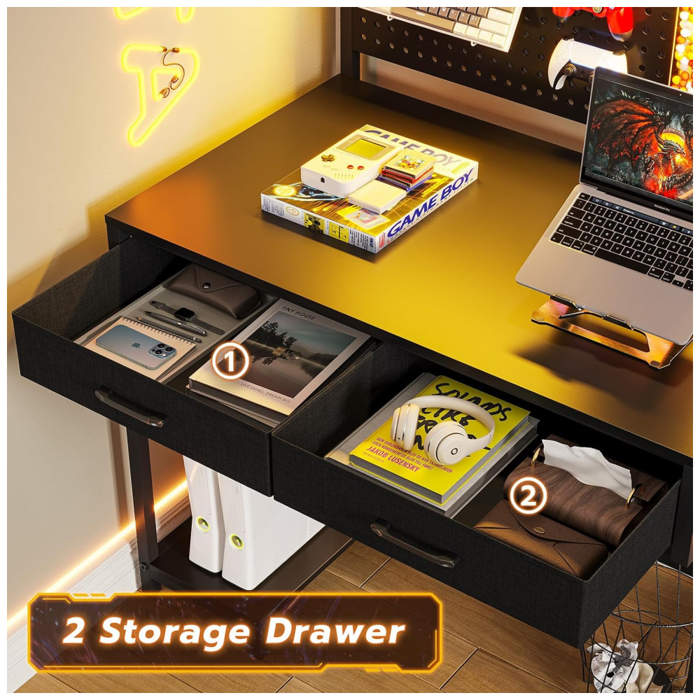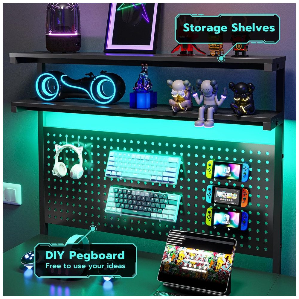 Características Especiais: Faixas de Luz LED RGB, Suporte para Monitor, 2 Gavetas de Tecido, 4 Prateleiras de Armazenamento, Painel Perfurado, Prateleira Superior (Hutch Shelf)