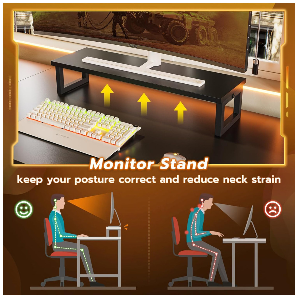 Além das luzes LED, a mesa inclui uma gaveta, prateleira de armazenamento, painel perfurado, suporte para monitor, gancho para fone de ouvido e suporte para CPU. As quatro grandes prateleiras de armazenamento são perfeitas para guardar equipamentos de jogos, livros, torres de CPU, alto-falantes, PS4, Xbox e gamepads. O suporte para monitor ajuda a reduzir a dor no pescoço, enquanto o grande painel perfurado pode ser utilizado para exibir e organizar pequenos itens.