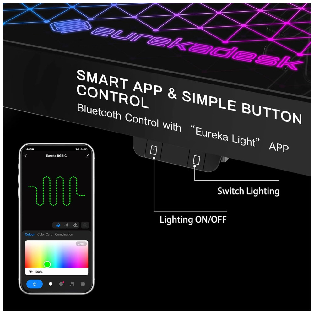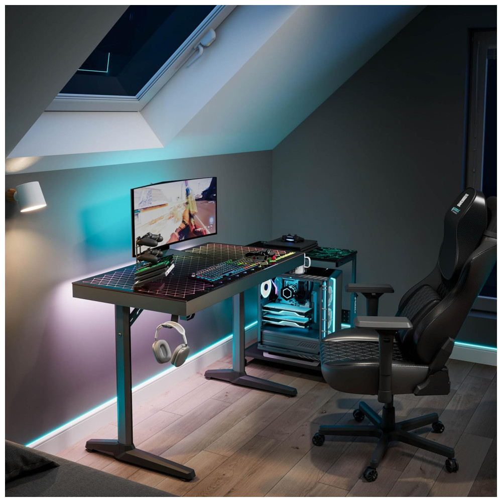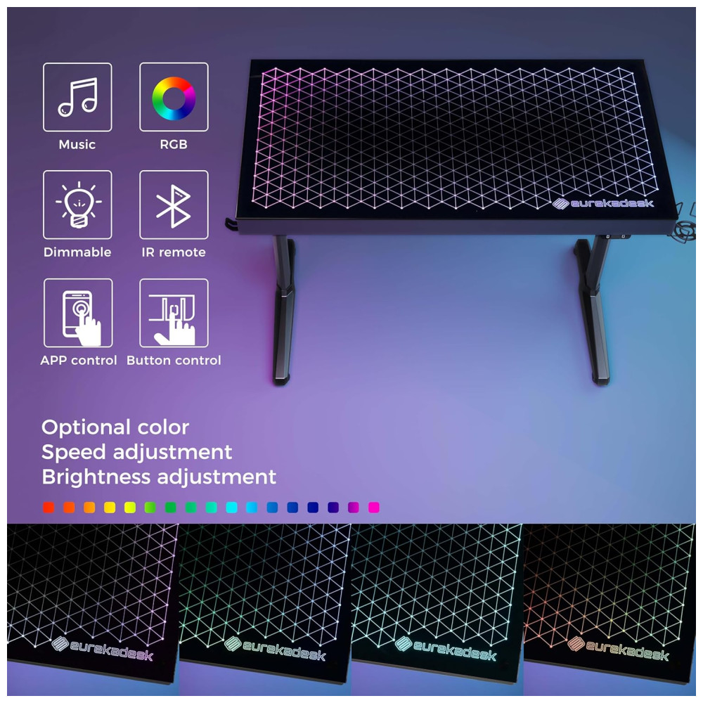 A mesa de jogo GTG I43 da Eureka Ergonomic apresenta um design inovador com efeitos de iluminação LED RGB Music Sync patenteados. A mesa, com tampo de vidro temperado de 4,6 mm de espessura, proporciona uma experiência visual única, sincronizando iluminação, música e jogo para um espetáculo completo.