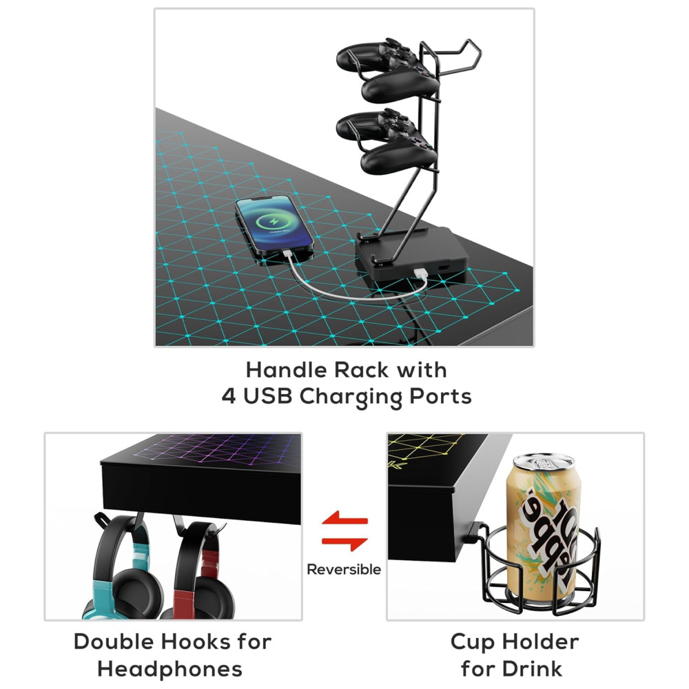 O pacote inclui acessórios práticos para gamers: um rack para controle com 4 portas de carregamento USB, porta-copos, gancho para fone de ouvido e um mouse pad. Com dimensões de 109,22 cm x 60,96 cm x 76,20 cm, esta mesa é ideal para meninos e meninas que estão se preparando para a volta às aulas.