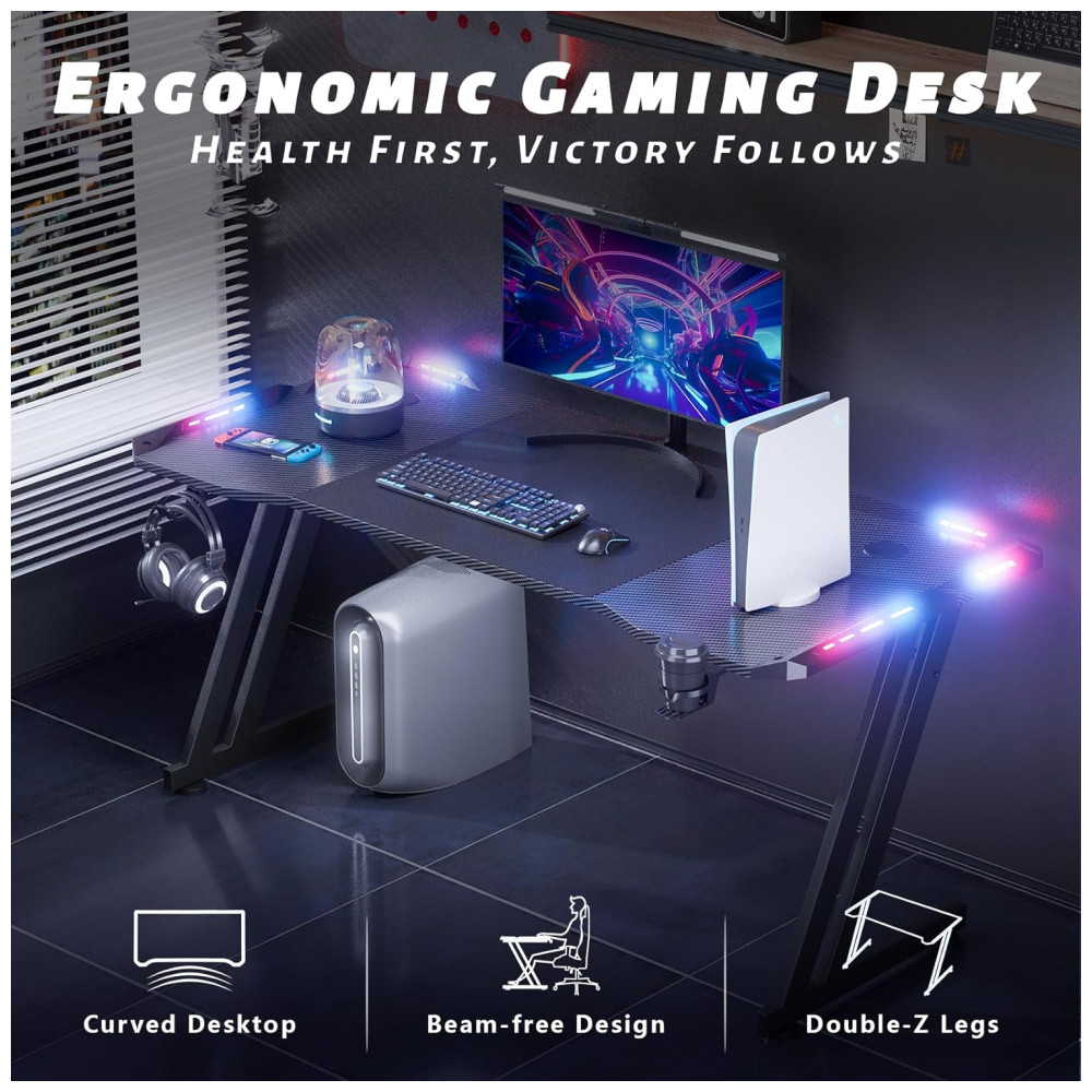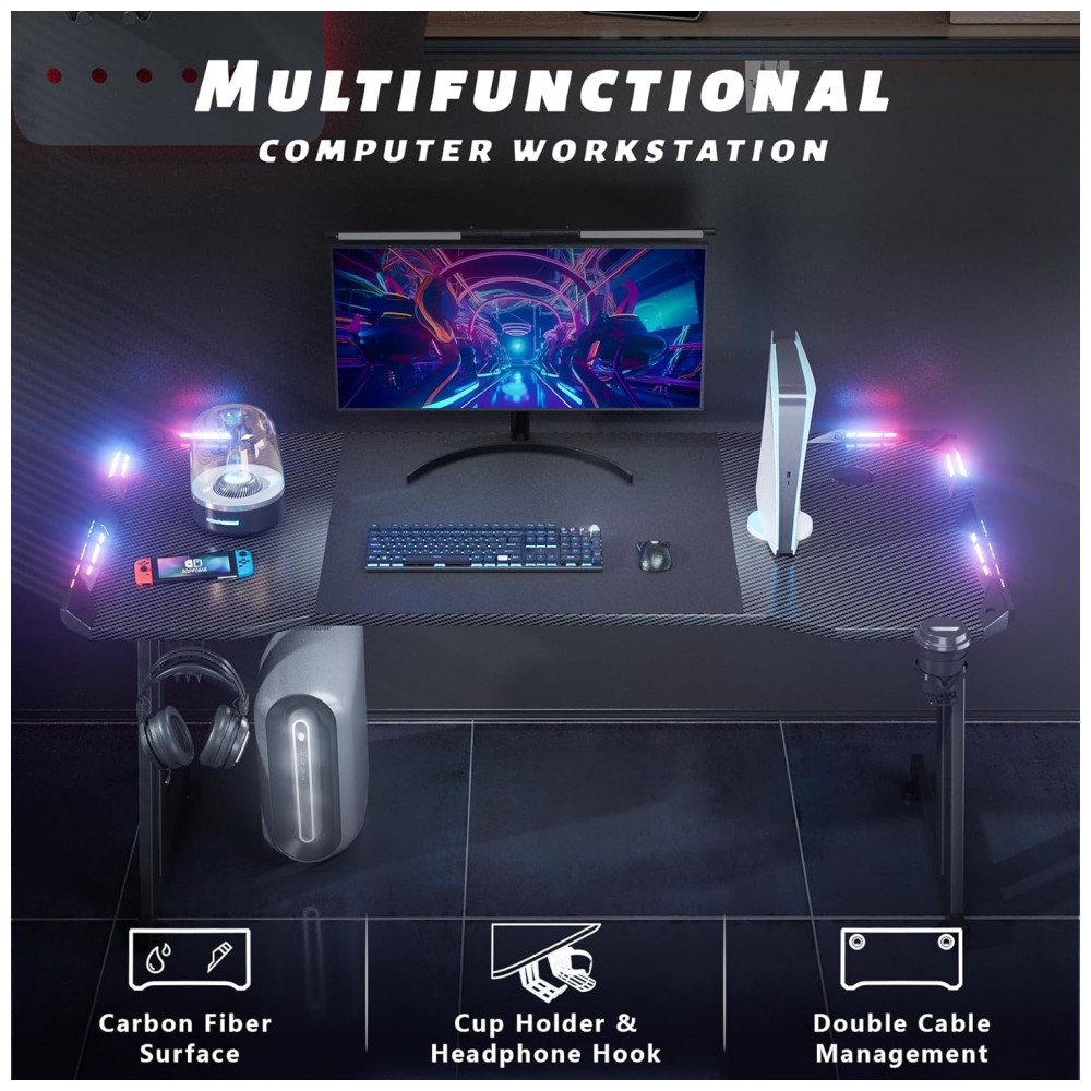 Mesa Gamer Ergonômica 47″ 119 cm com Superfície de Fibra de Carbono Gancho para Fone de Ouvido Luz LED e Porta-Copos 110V HLDIRECT Preto