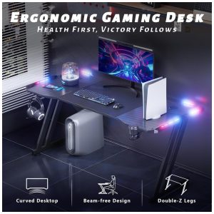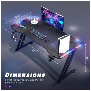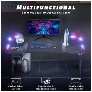 Mesa Gamer Ergonômica 55″ 139 cm com Superfície de Fibra de Carbono Gancho para Fone de Ouvido Luz LED e Porta-Copos 110V HLDIRECT MLHD14 Preto